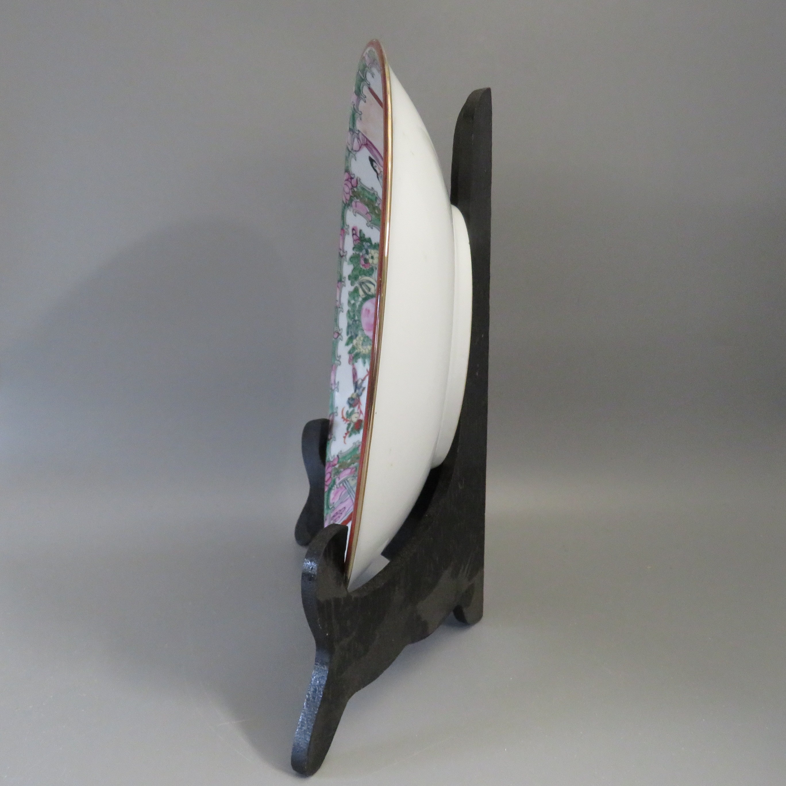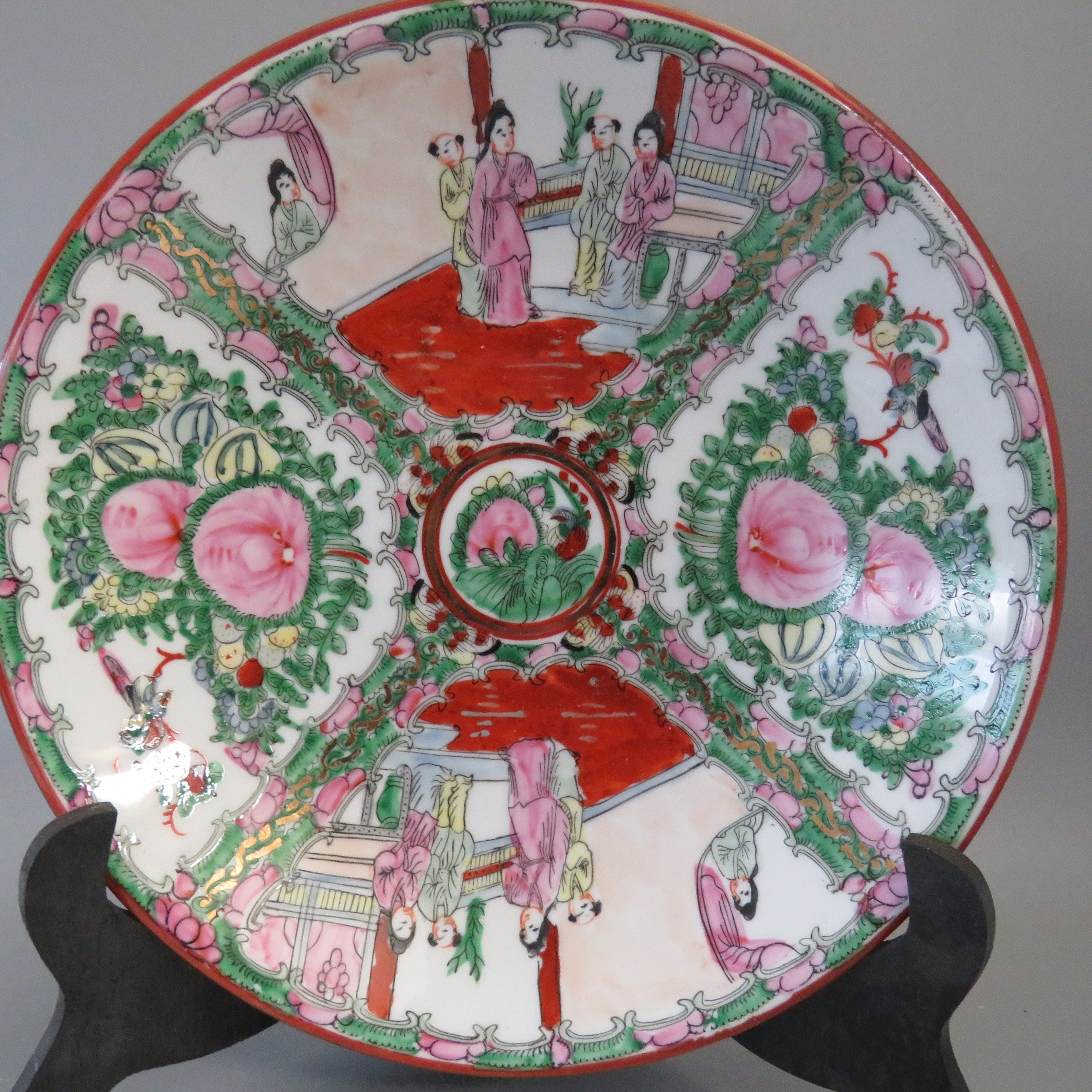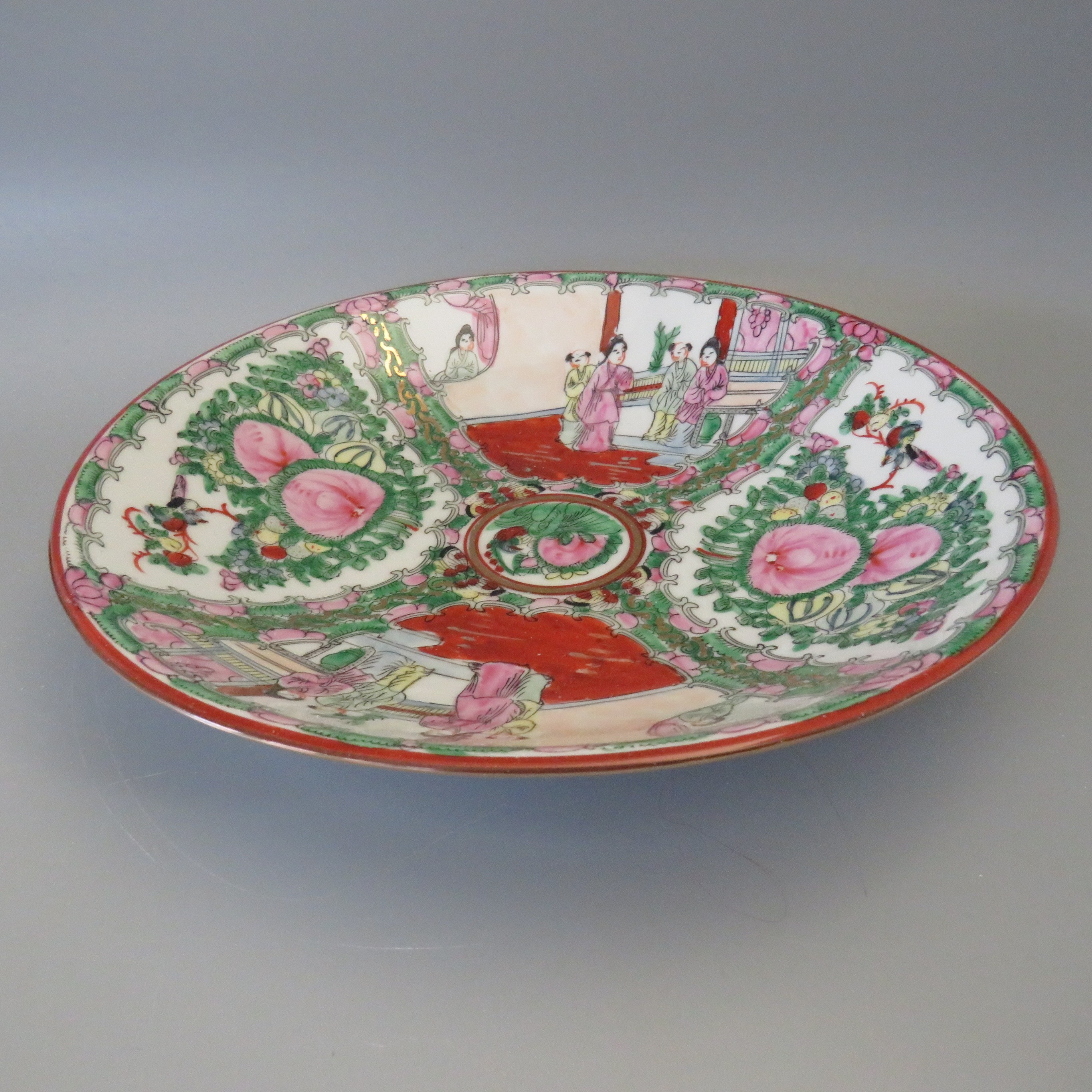 Grand bol / assiette vintage en porcelaine chinoise à décor de médaillon Famille Rose en rose et vert.