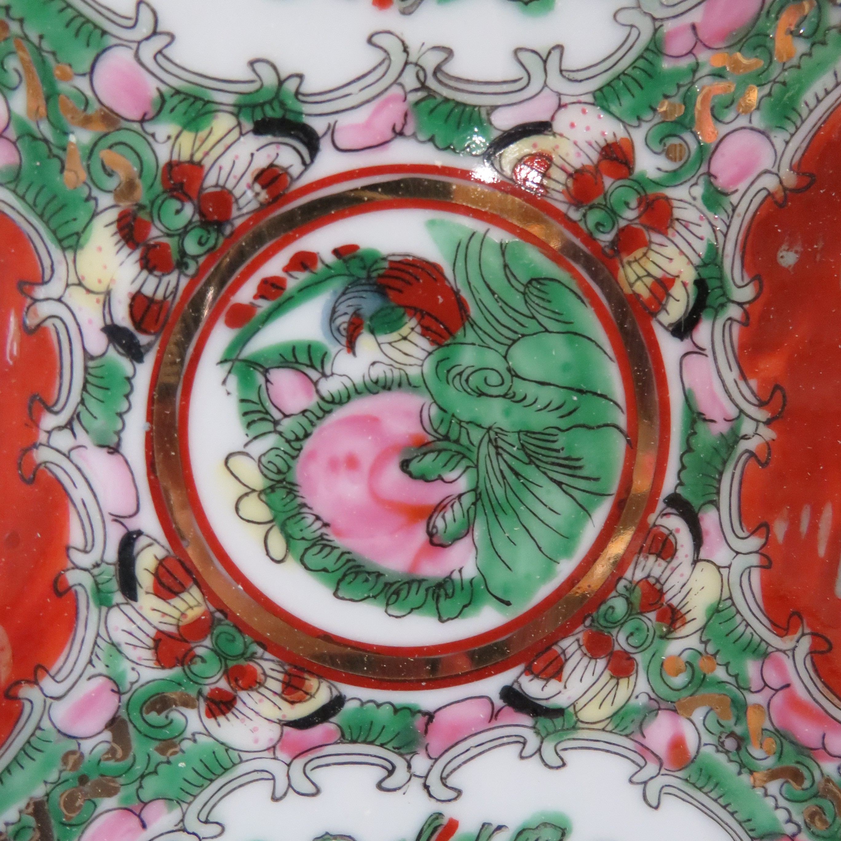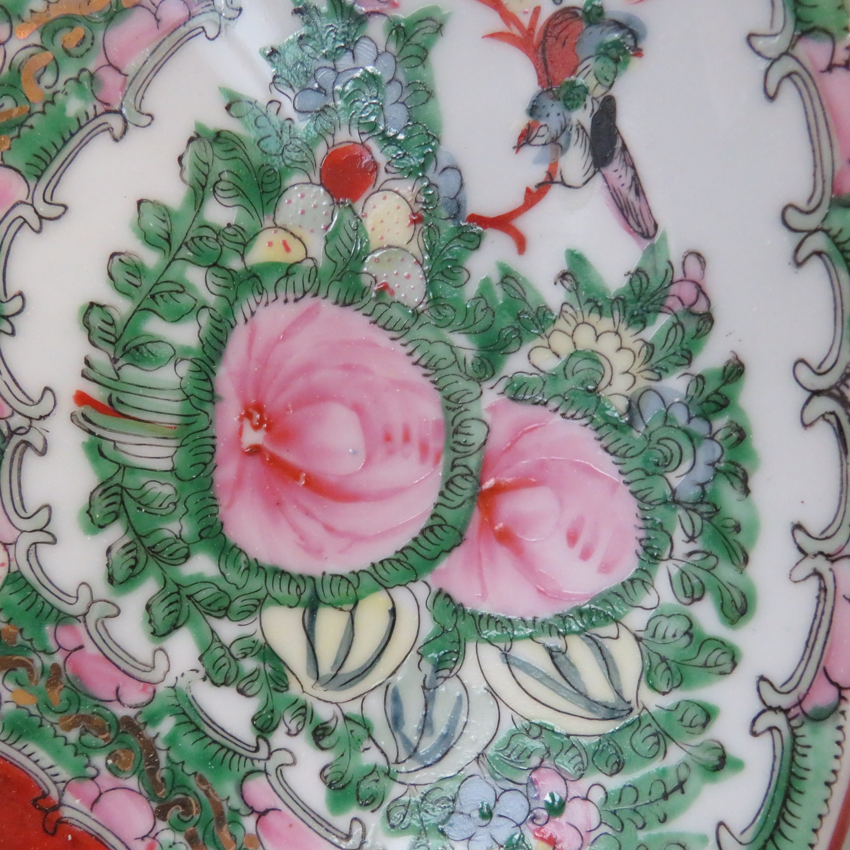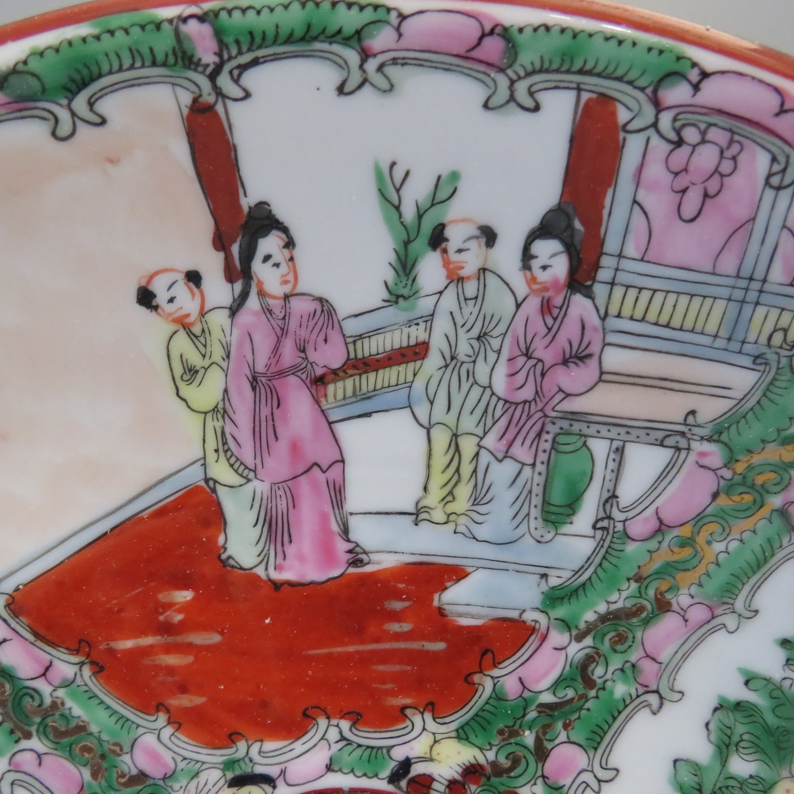 Grand bol / assiette vintage en porcelaine chinoise à décor de médaillon Famille Rose en rose et vert.