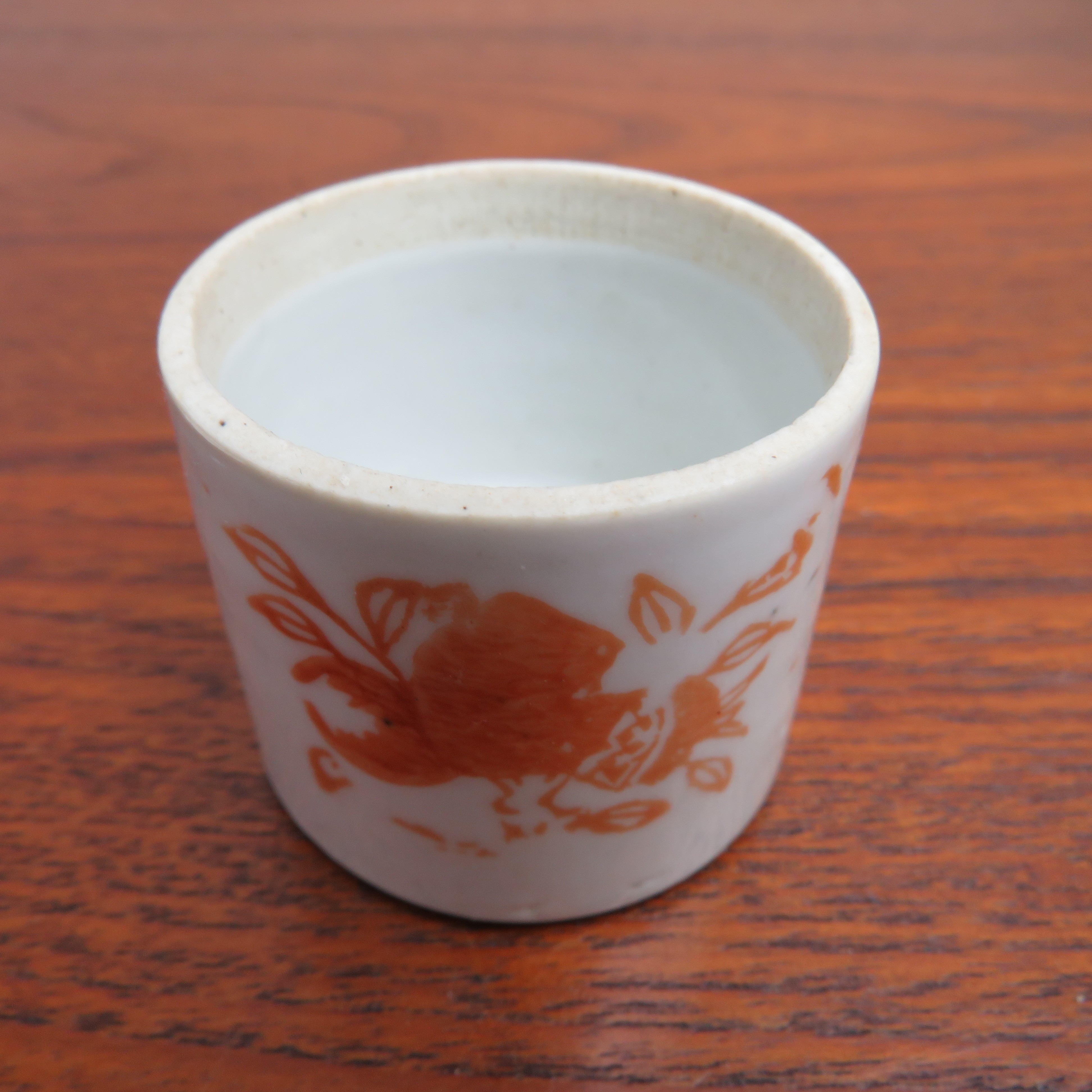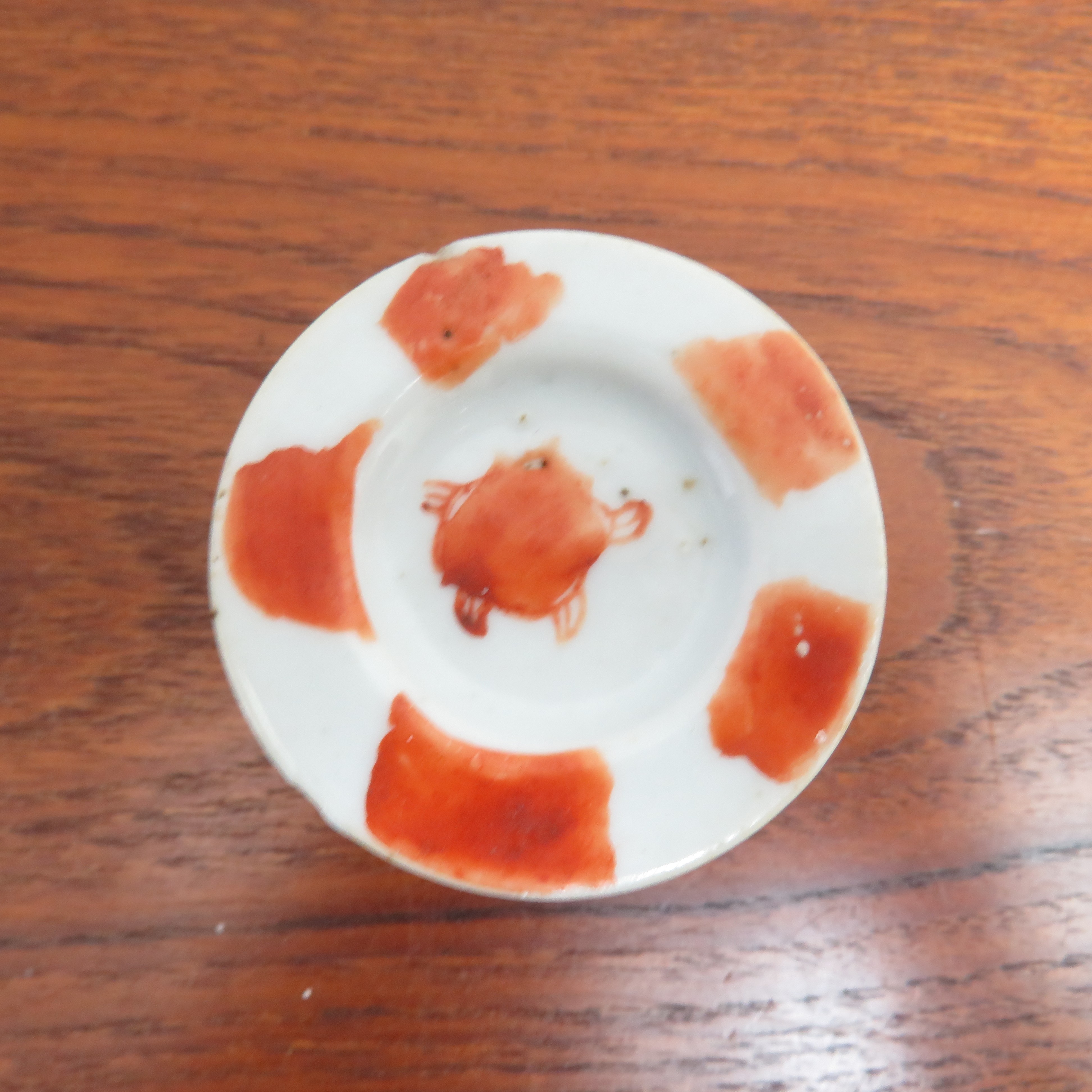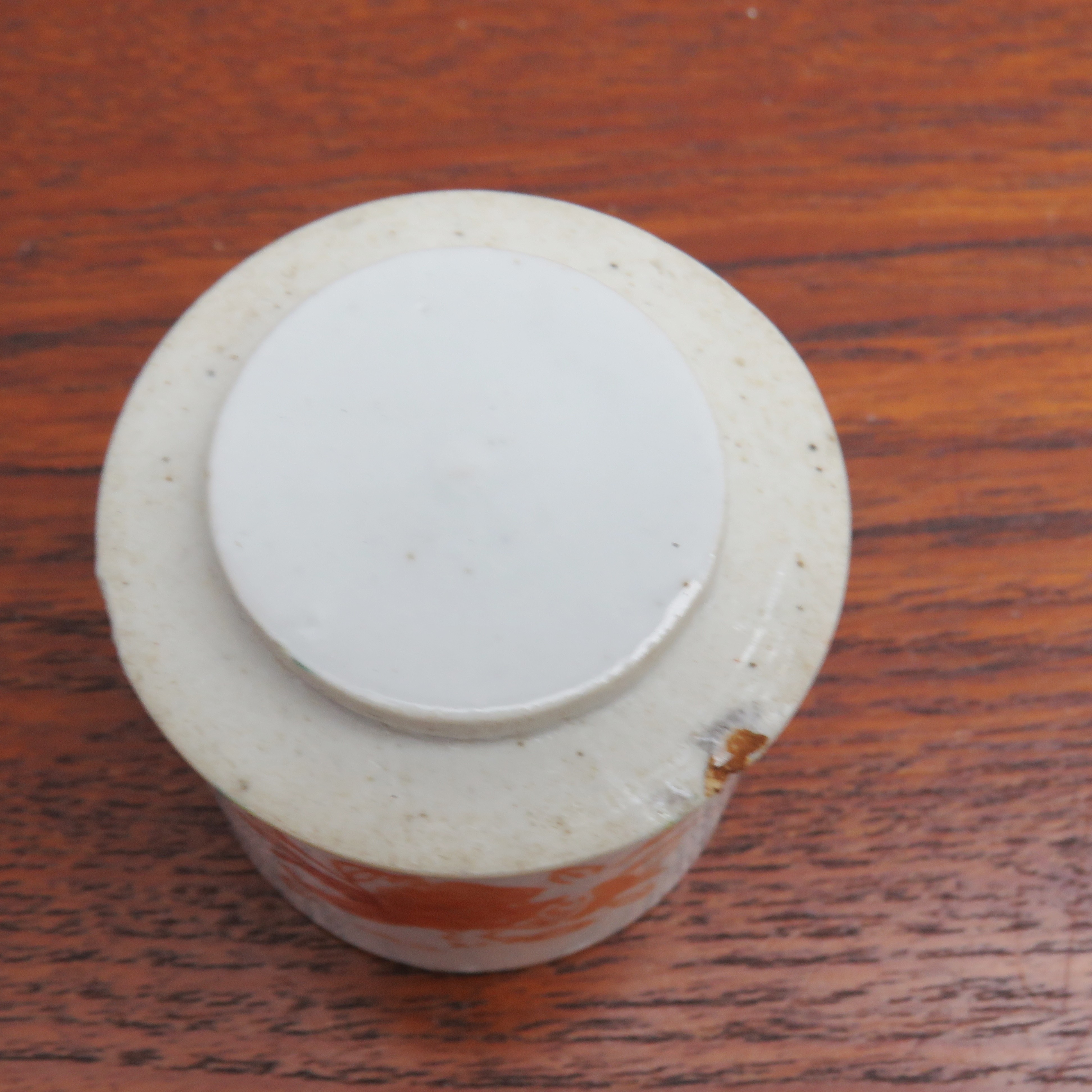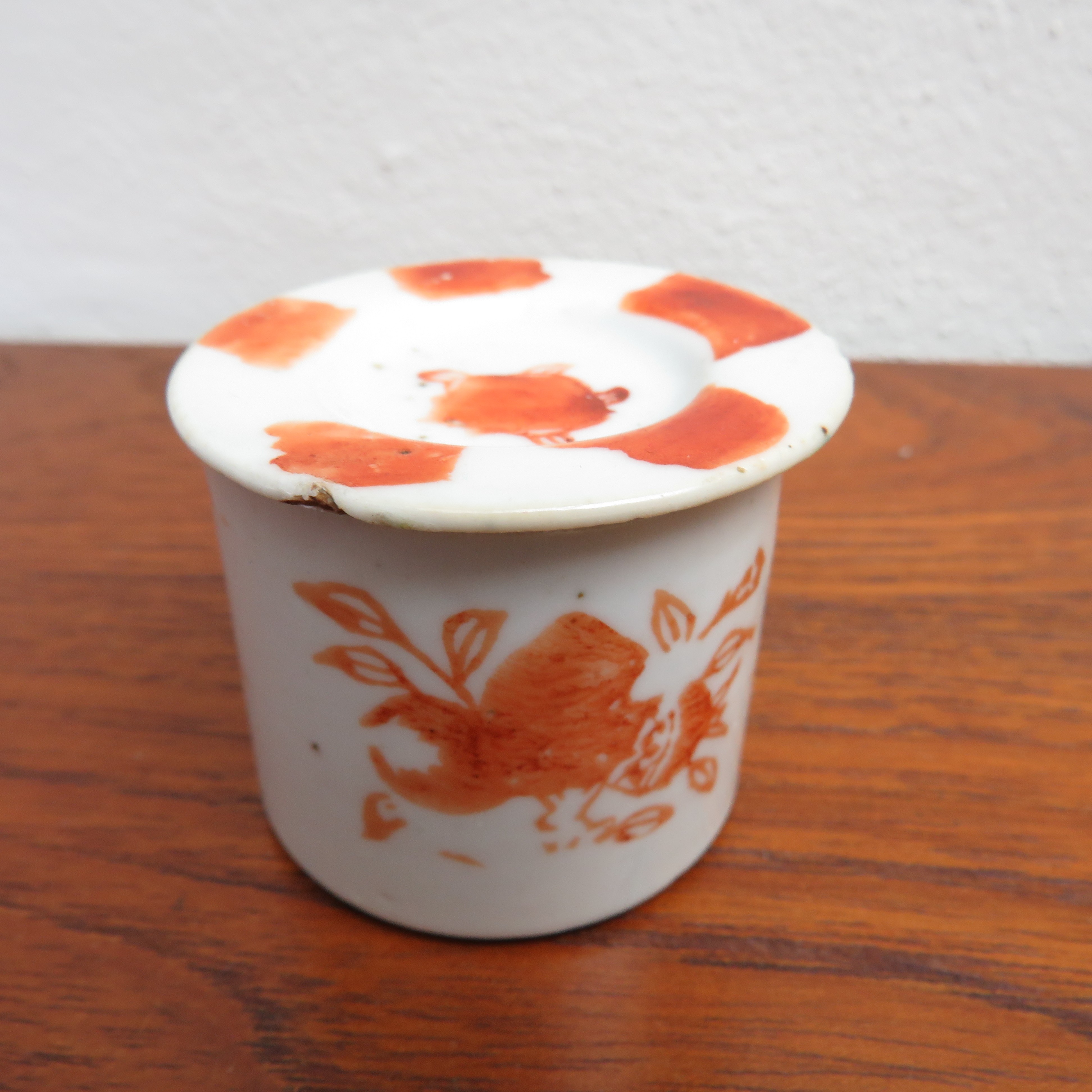 Antique Chinese porcelain lidded pill box - ointment jar. Red floral decoration.