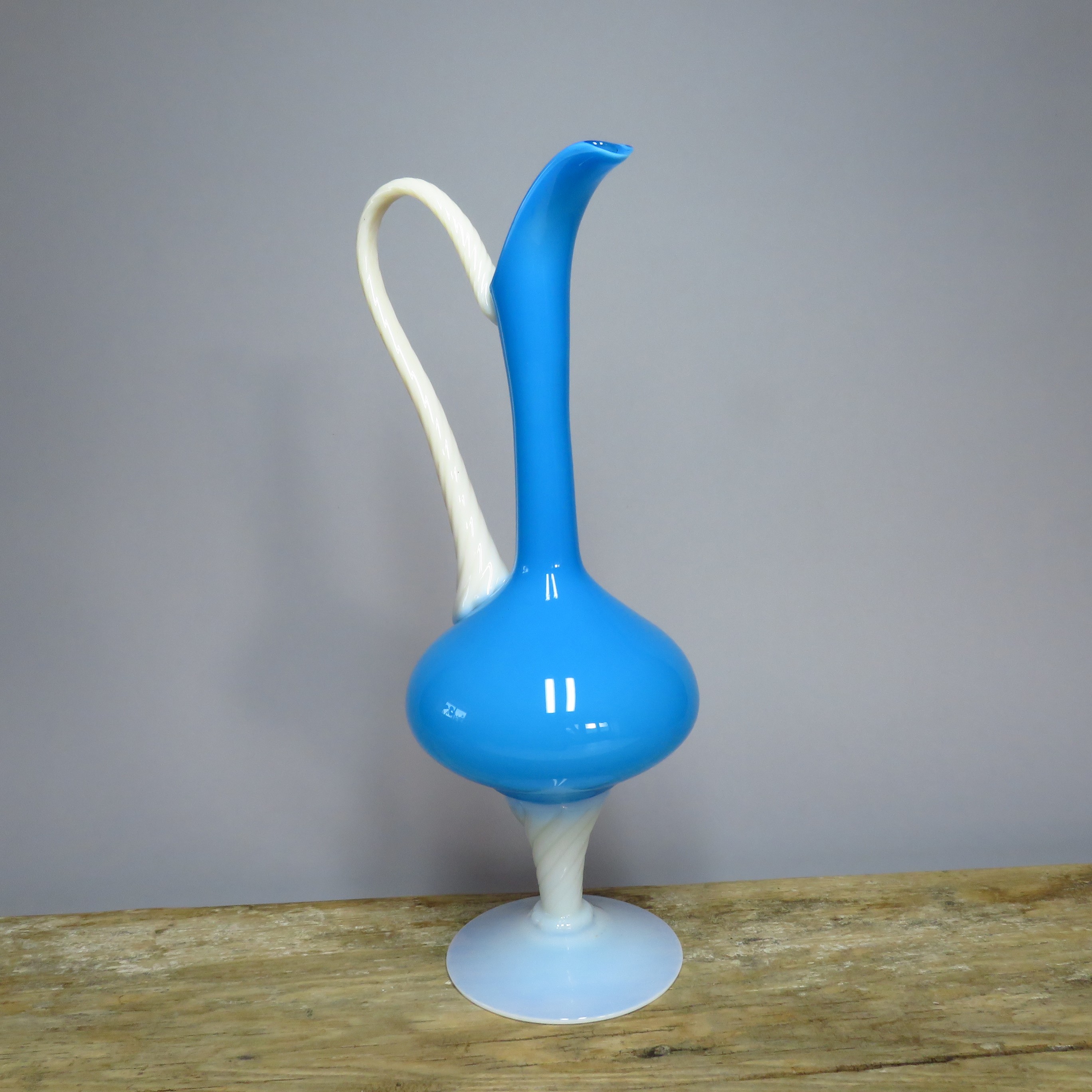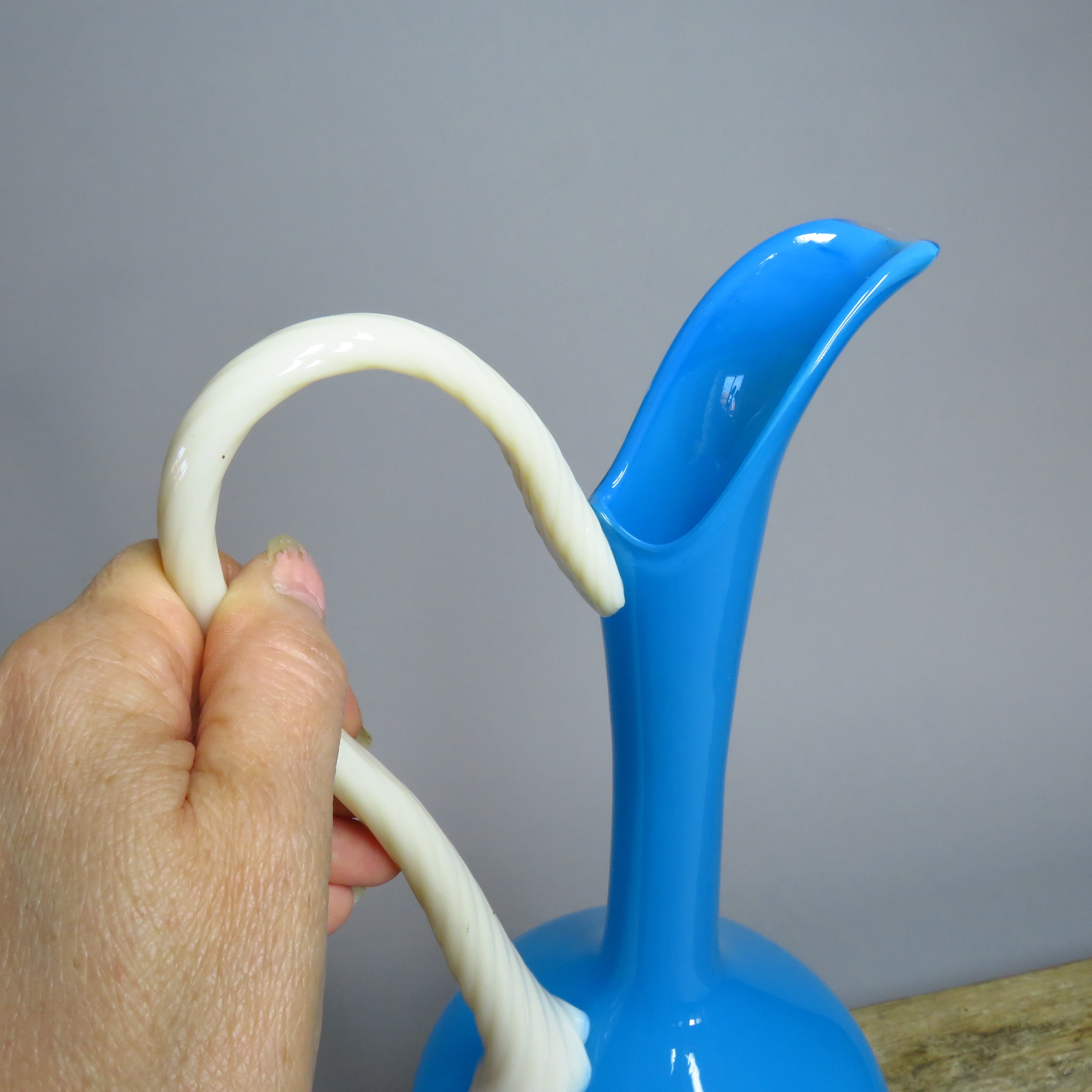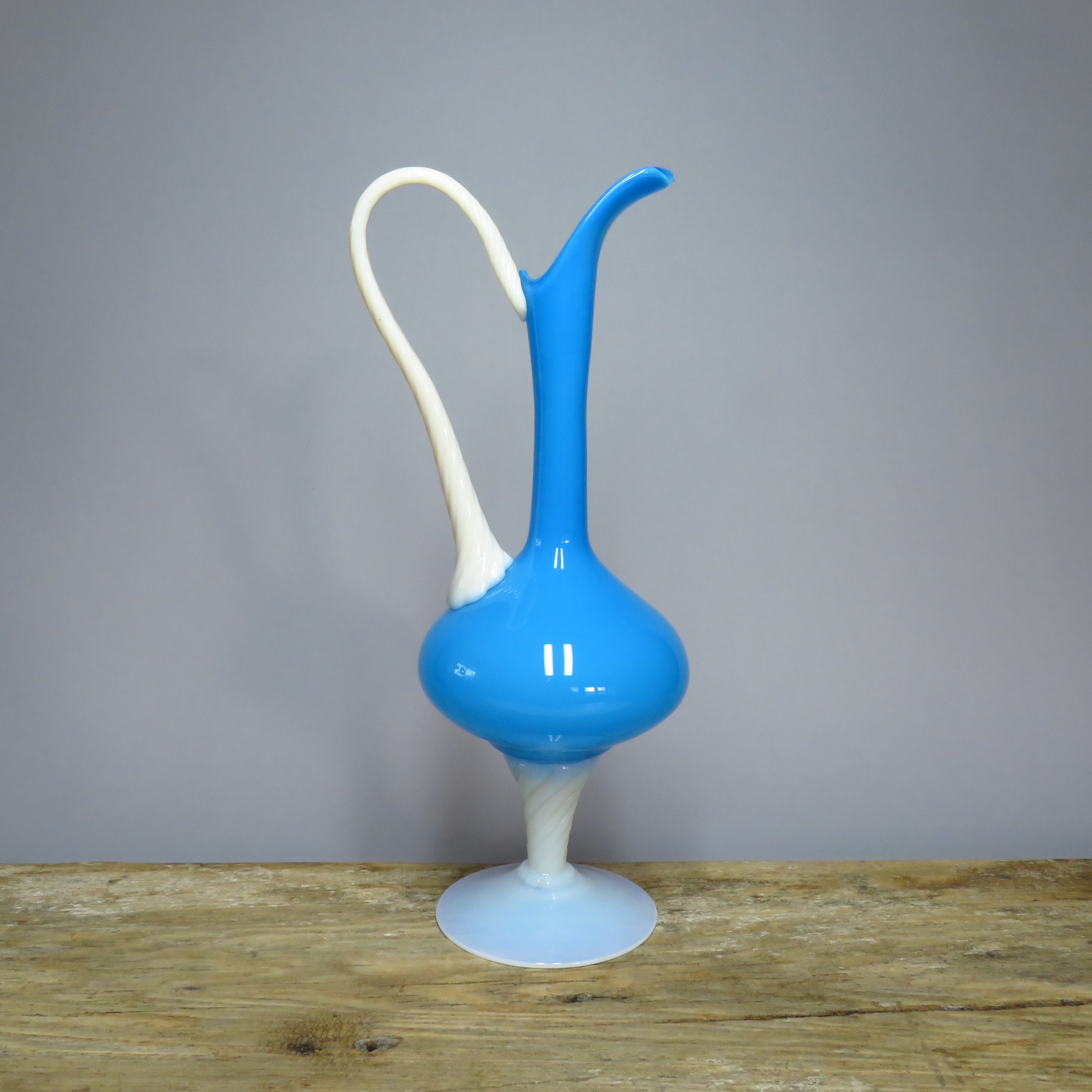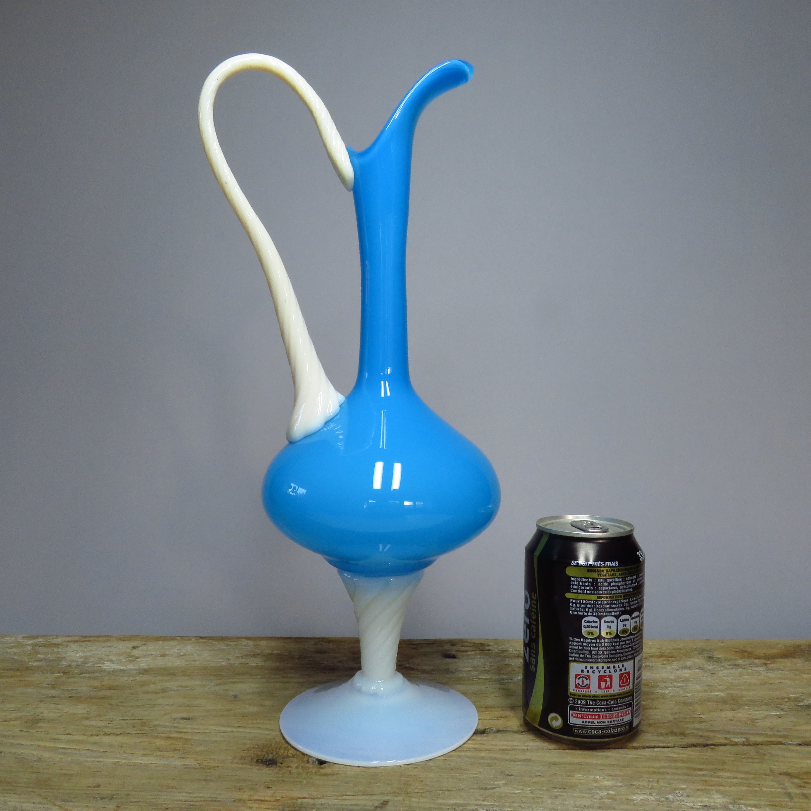 Vintage Grand vase pichet italien, réalisé en verre opalin bleu avec base blanche.