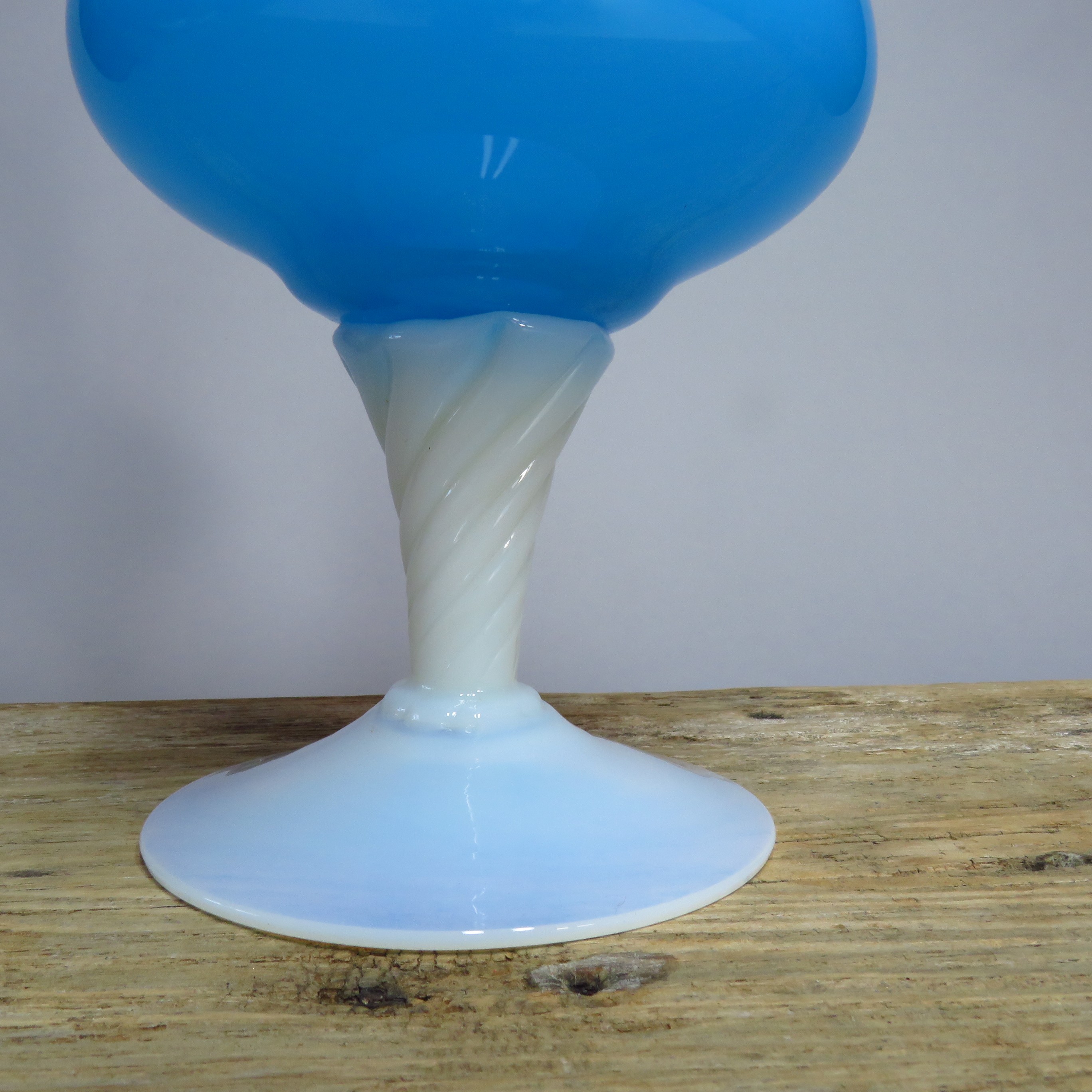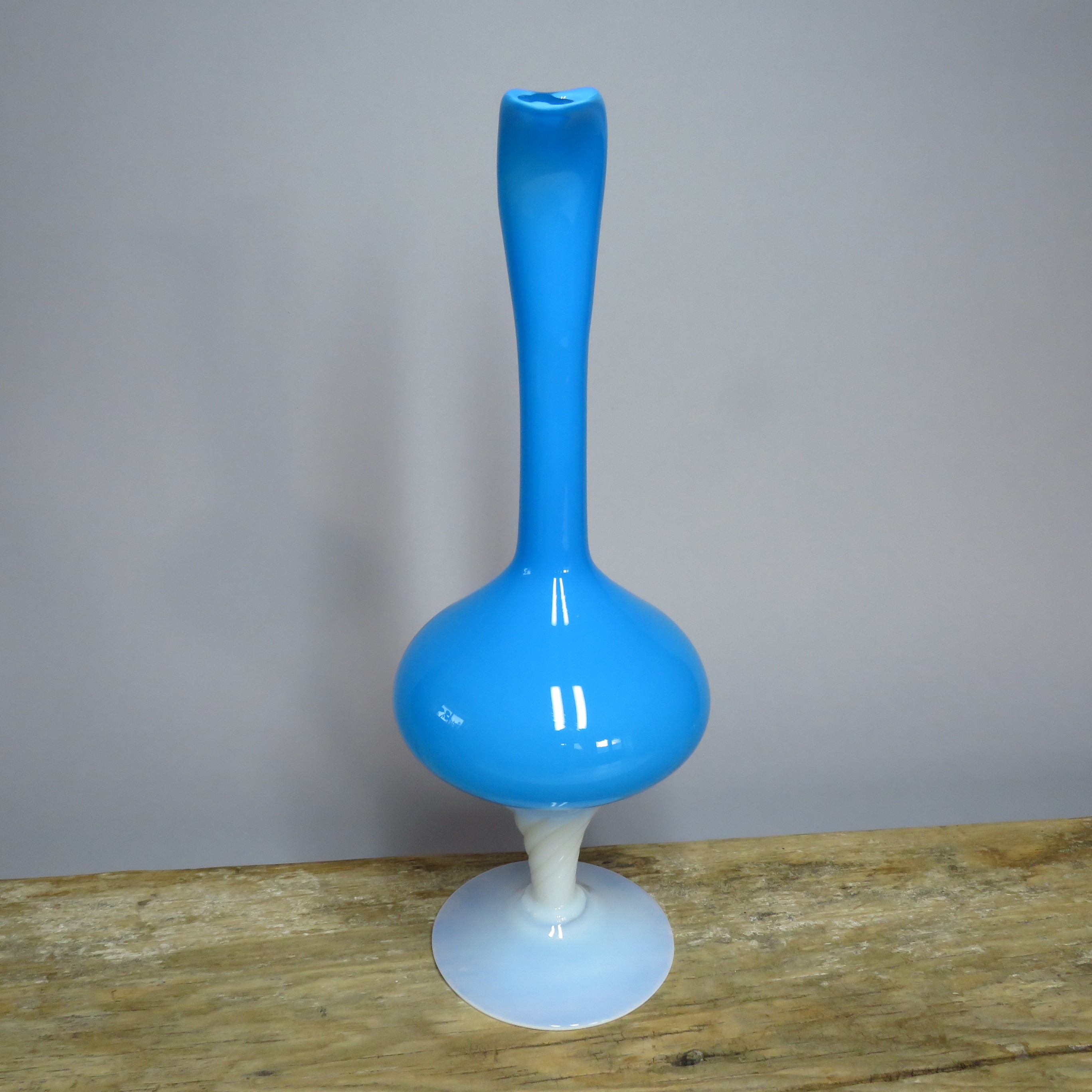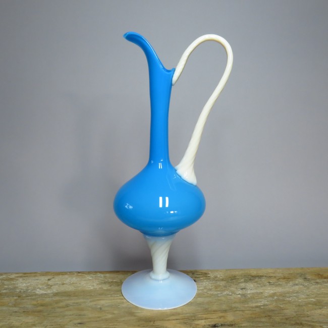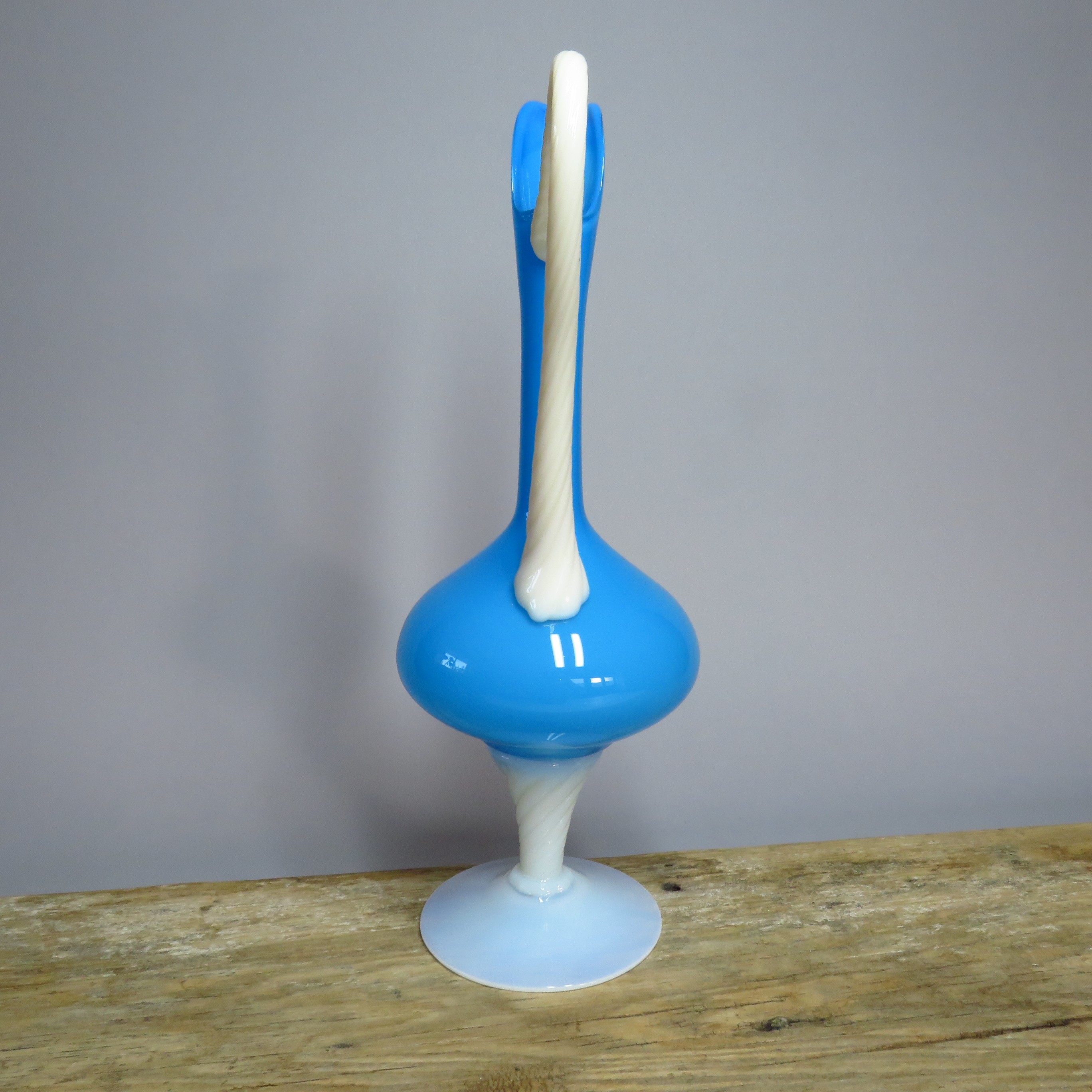 Vintage Grand vase pichet italien, réalisé en verre opalin bleu avec base blanche.