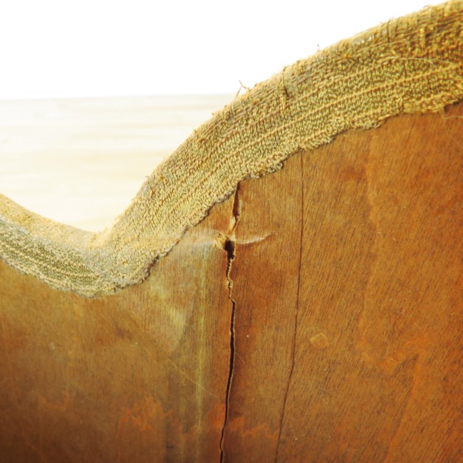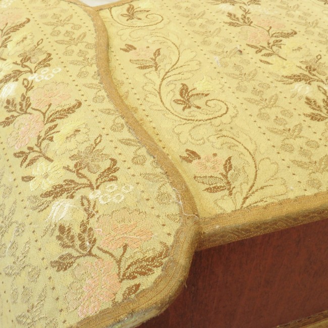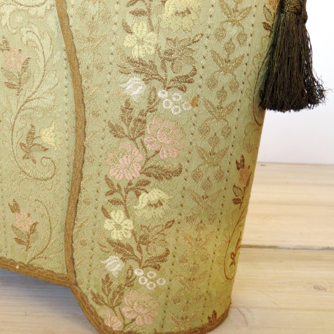 Magnifique porte-revues en bois recouvert d'un tissu floral vert avec un ruban couleur bronze sur les bords.