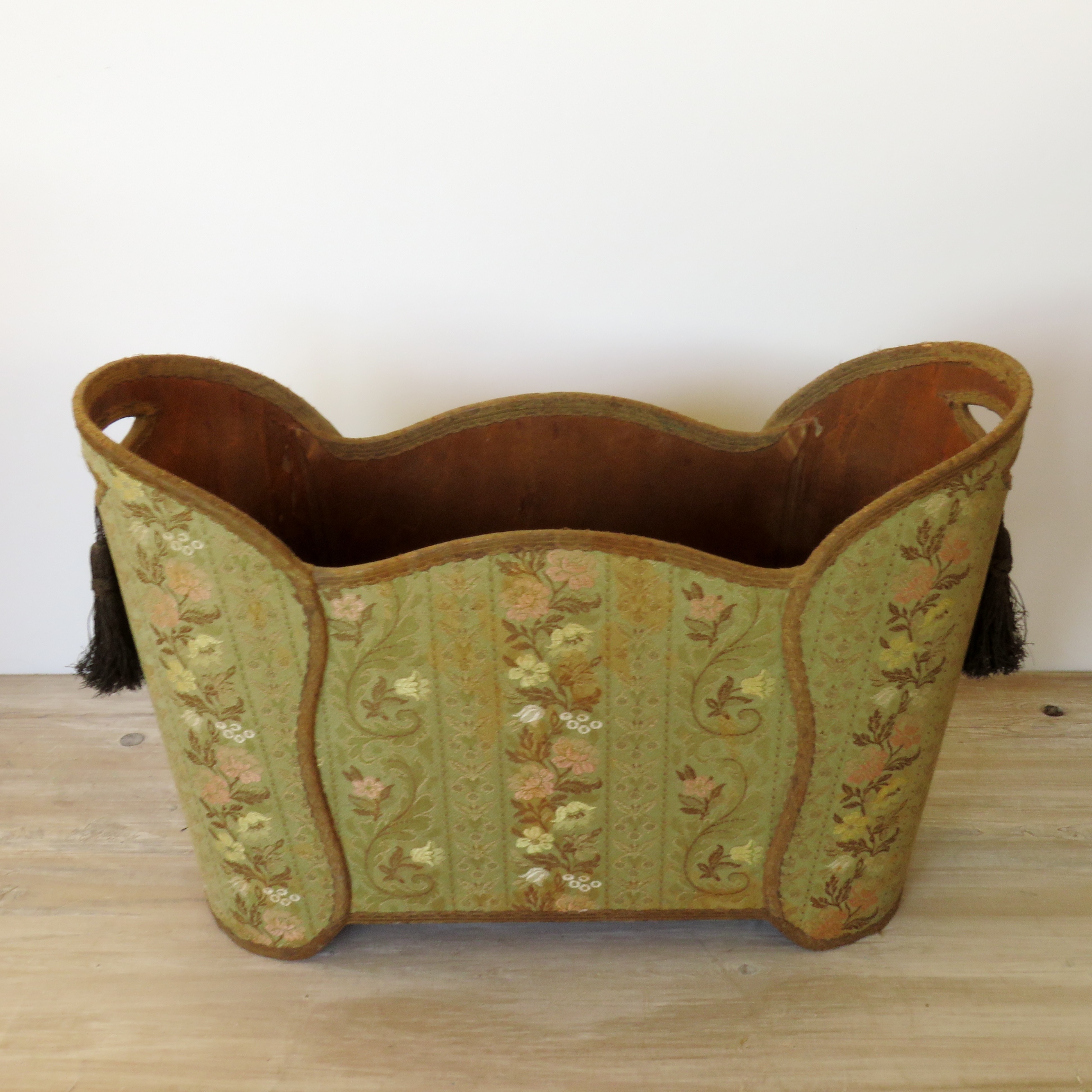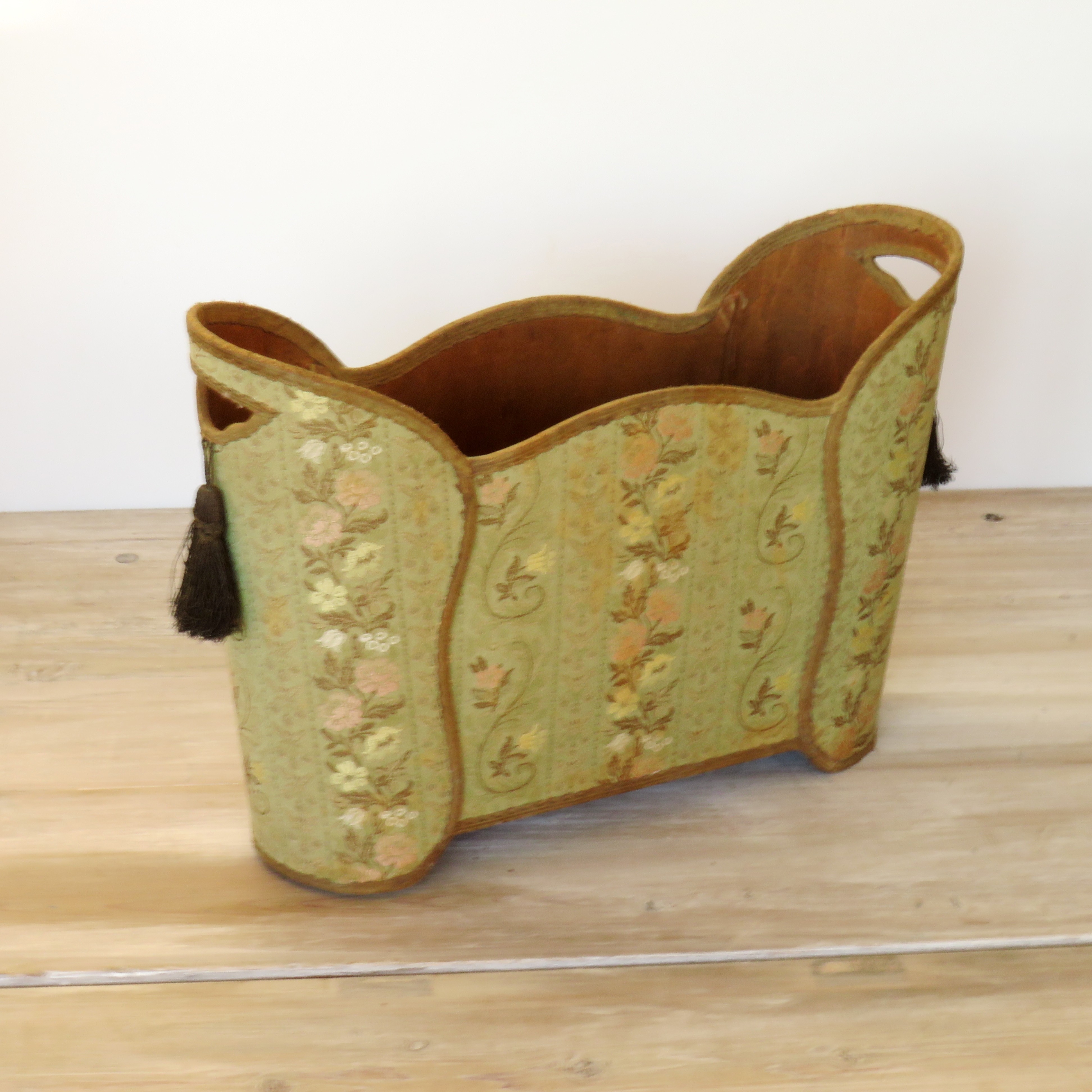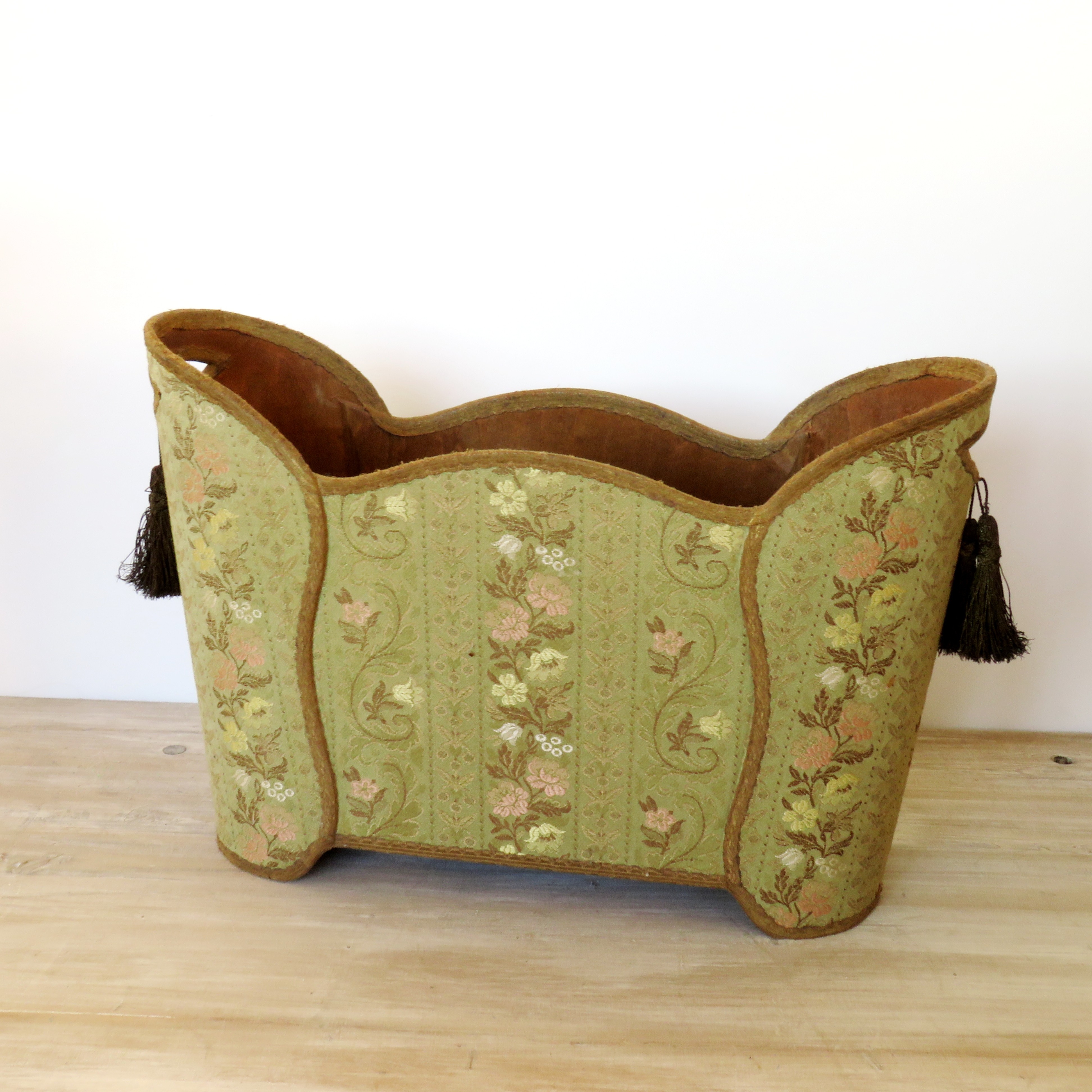 Absolutely stunning magazine rack, made of wood, covered with green floral fabric with a bronze color ribbon along the edges.