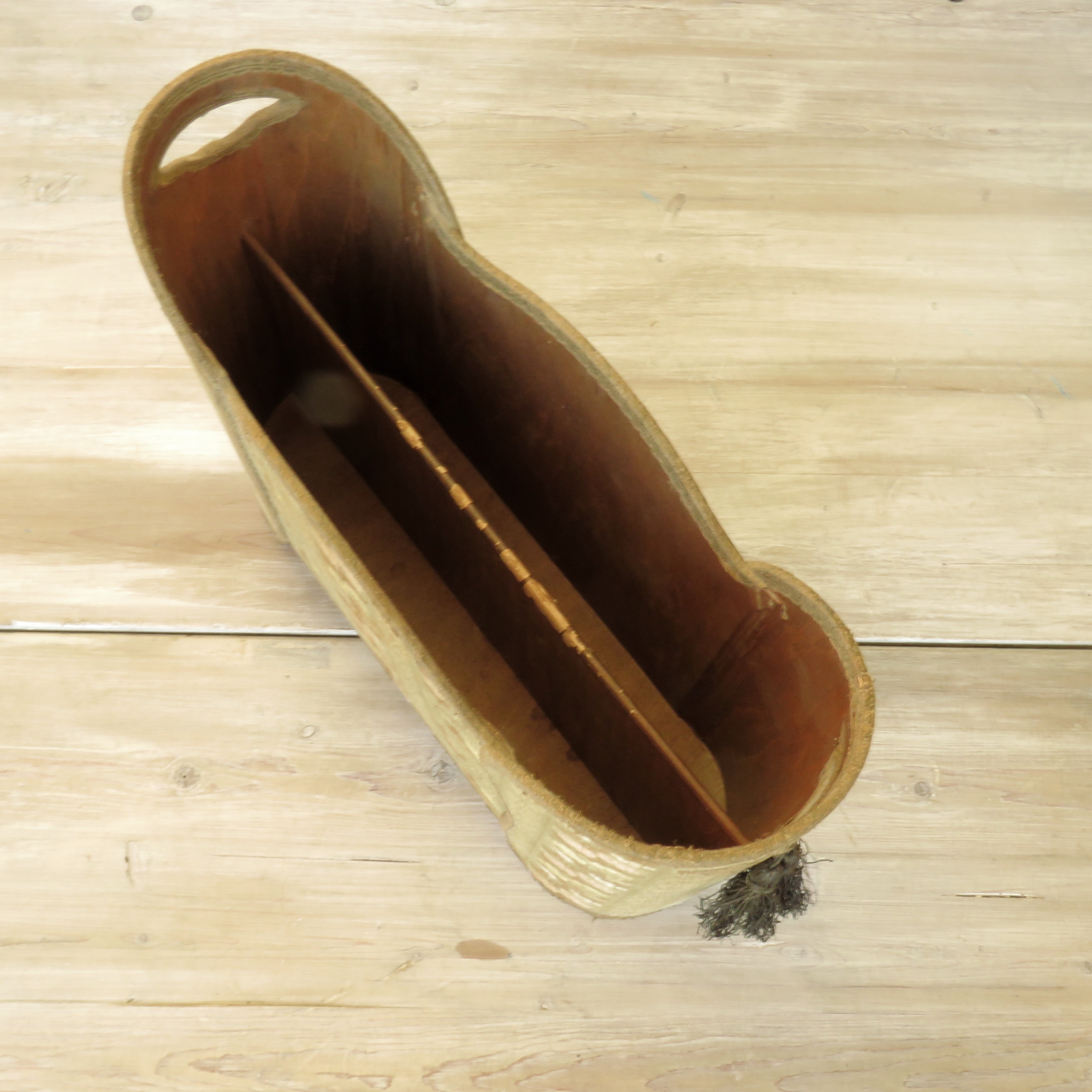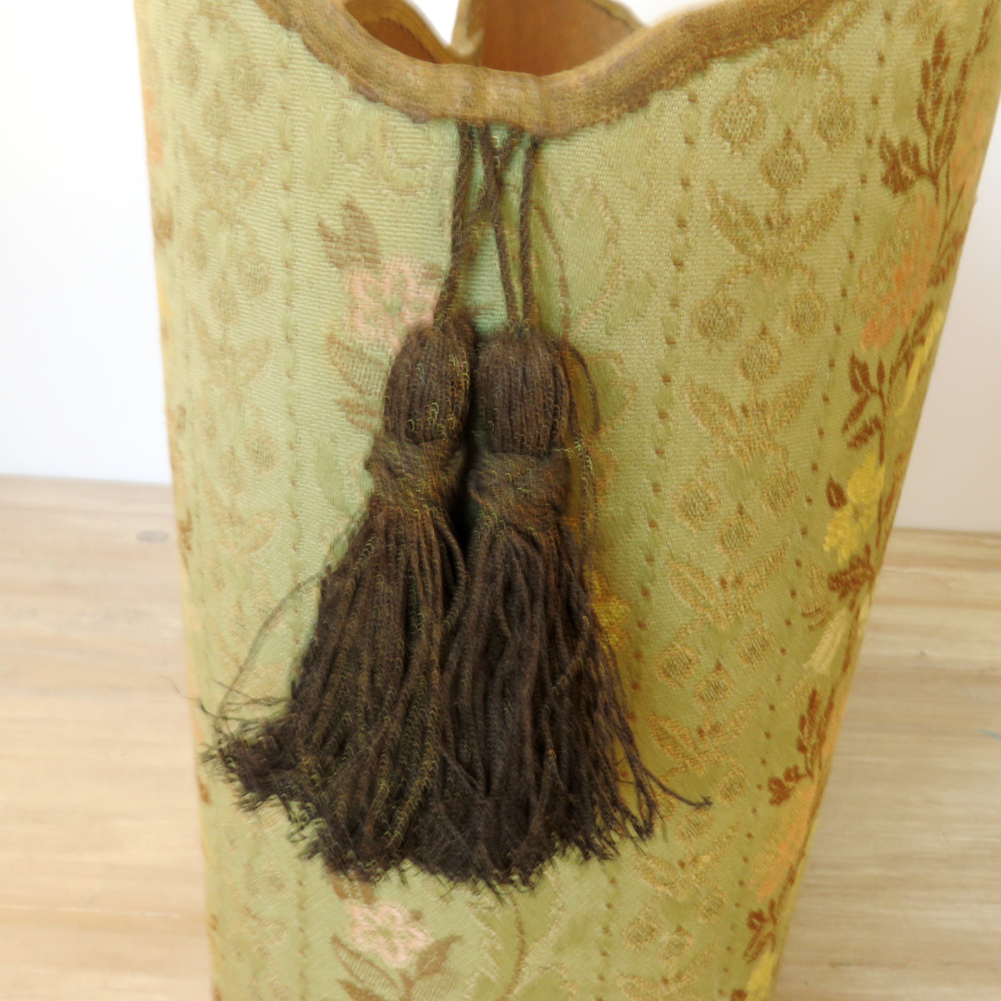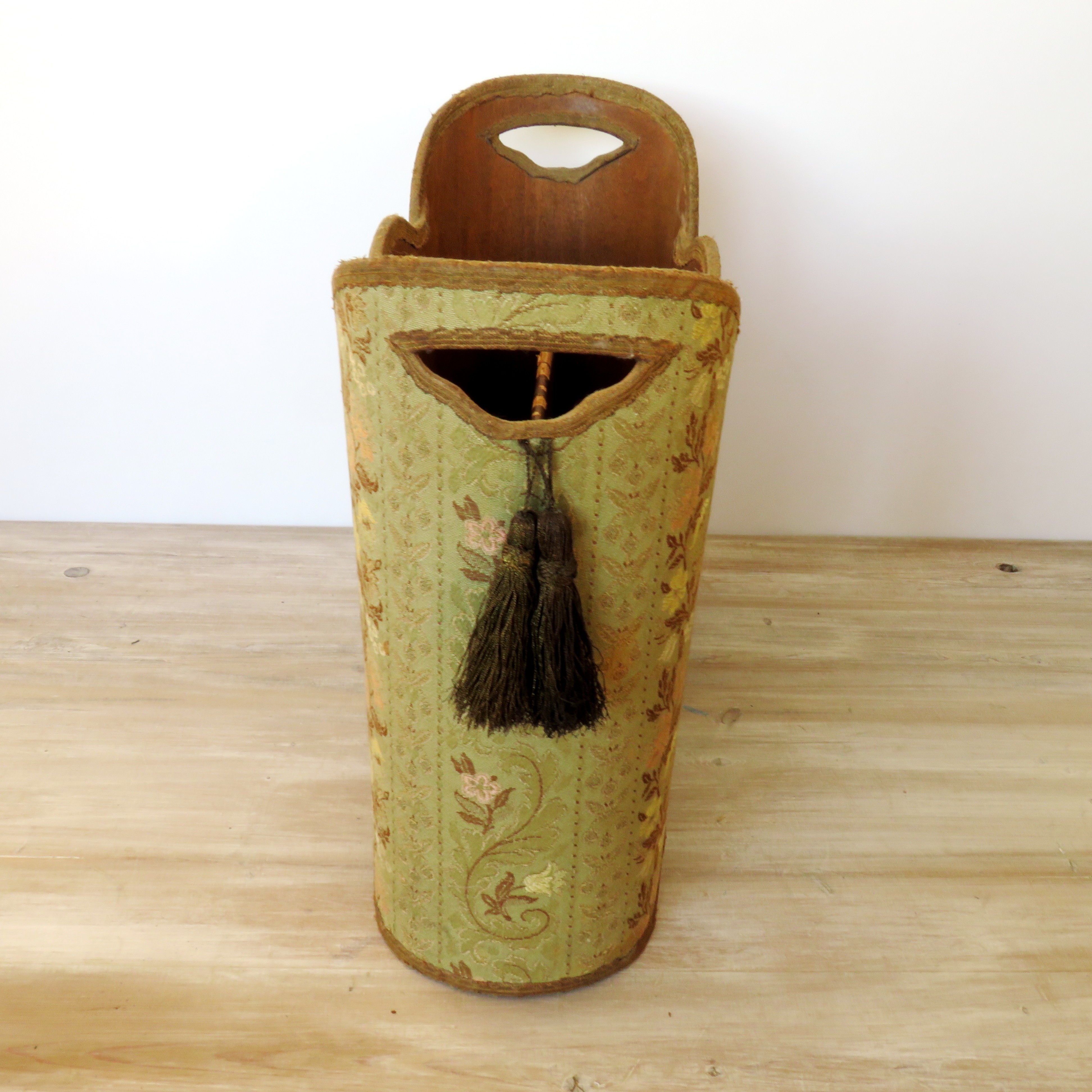 Absolutely stunning magazine rack, made of wood, covered with green floral fabric with a bronze color ribbon along the edges.