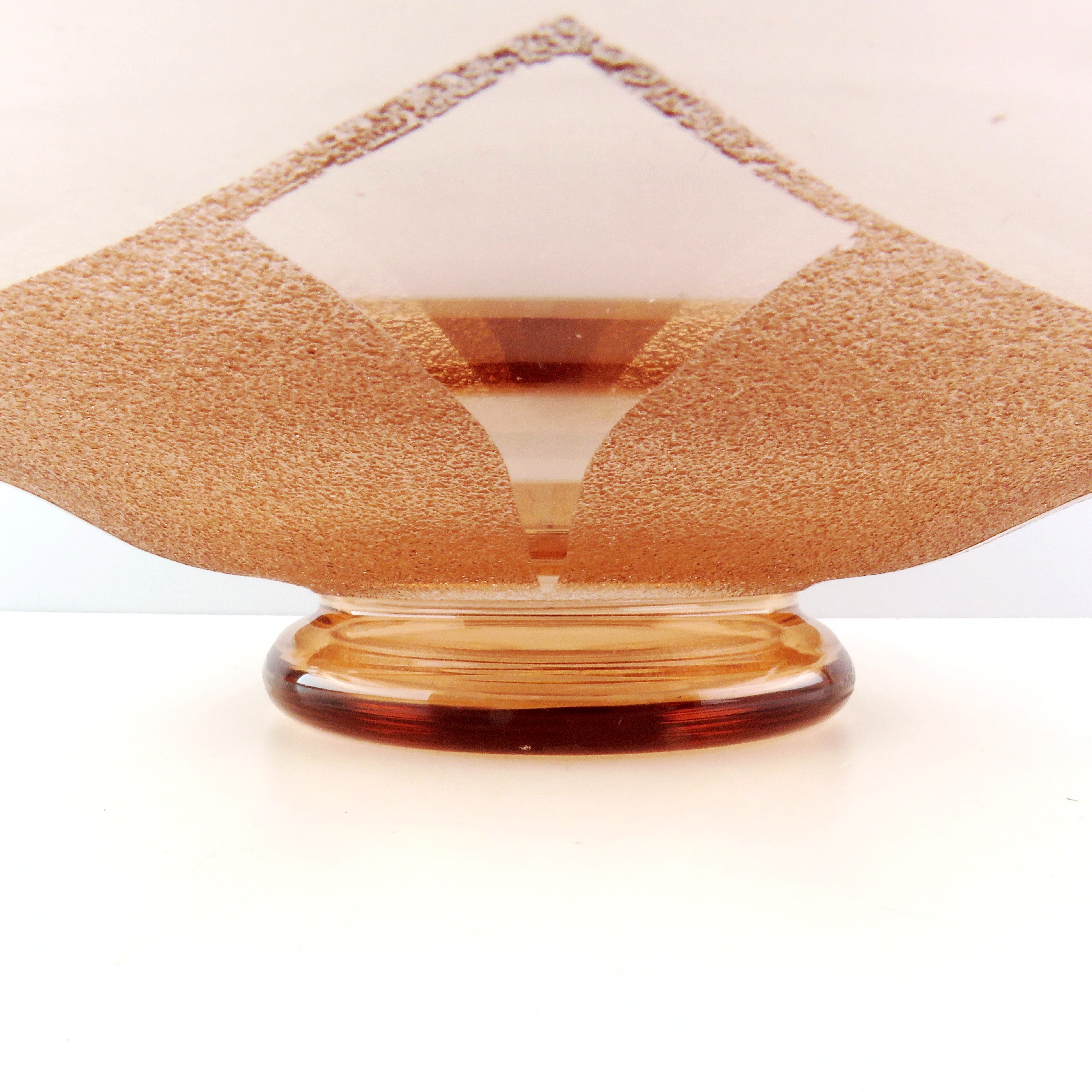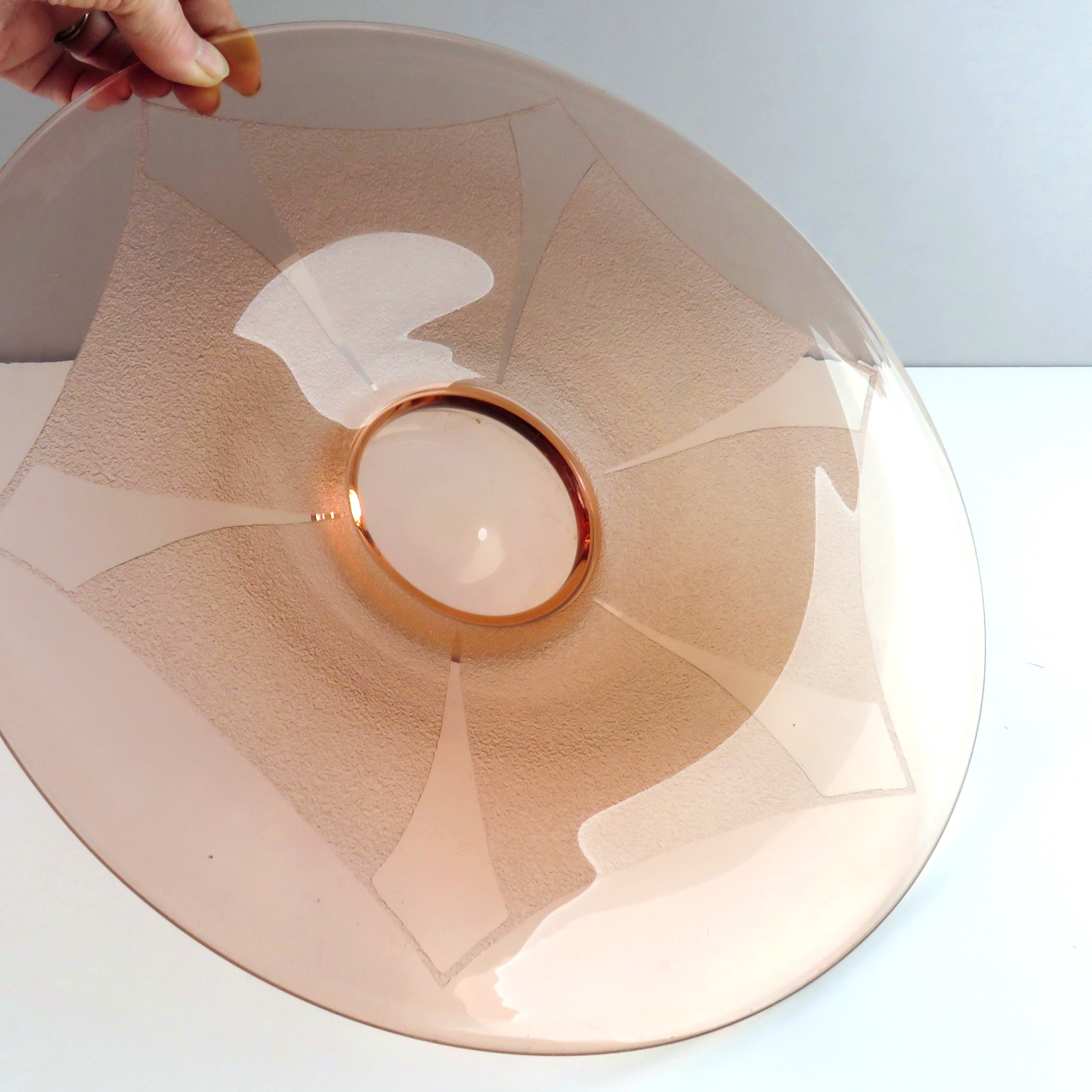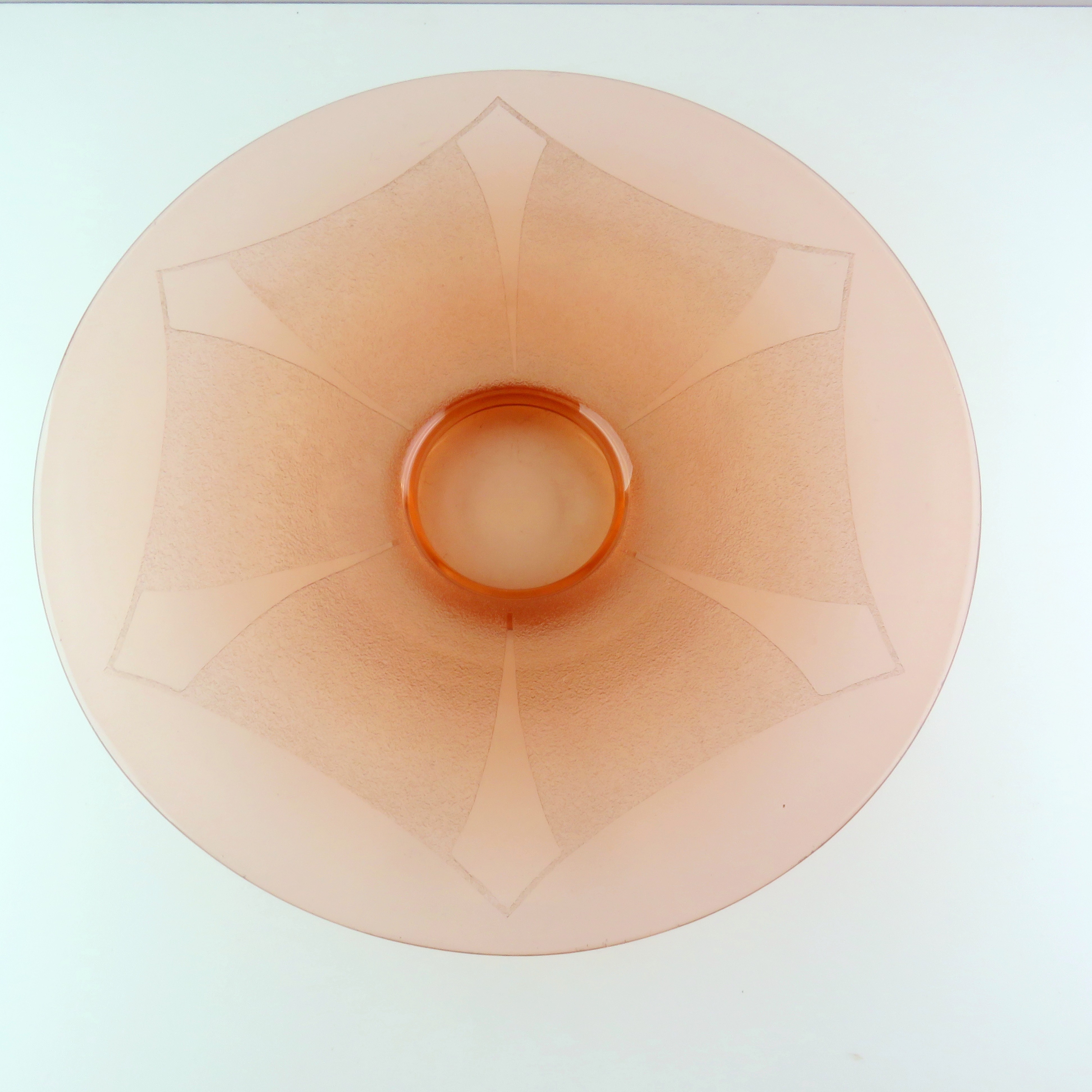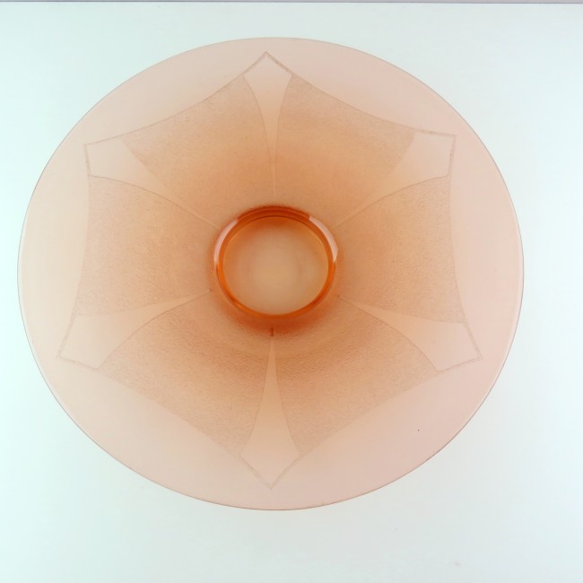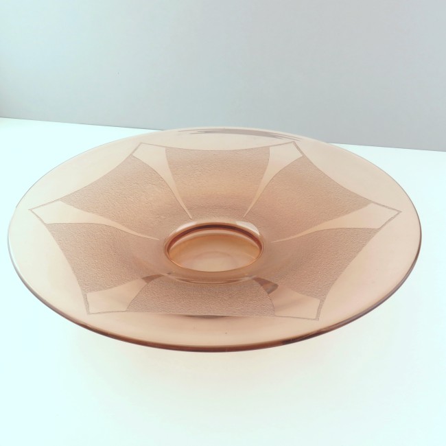 A shallow bowl with a soft peachy pink hue and with acid-etched geometric design.