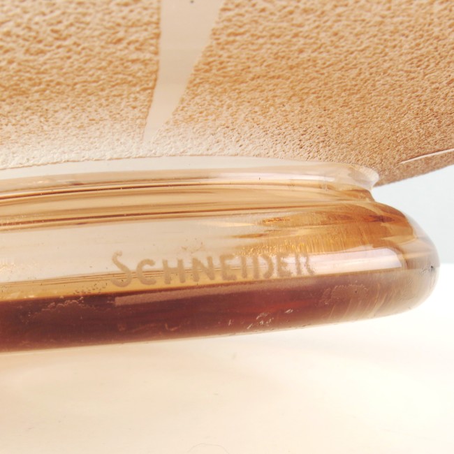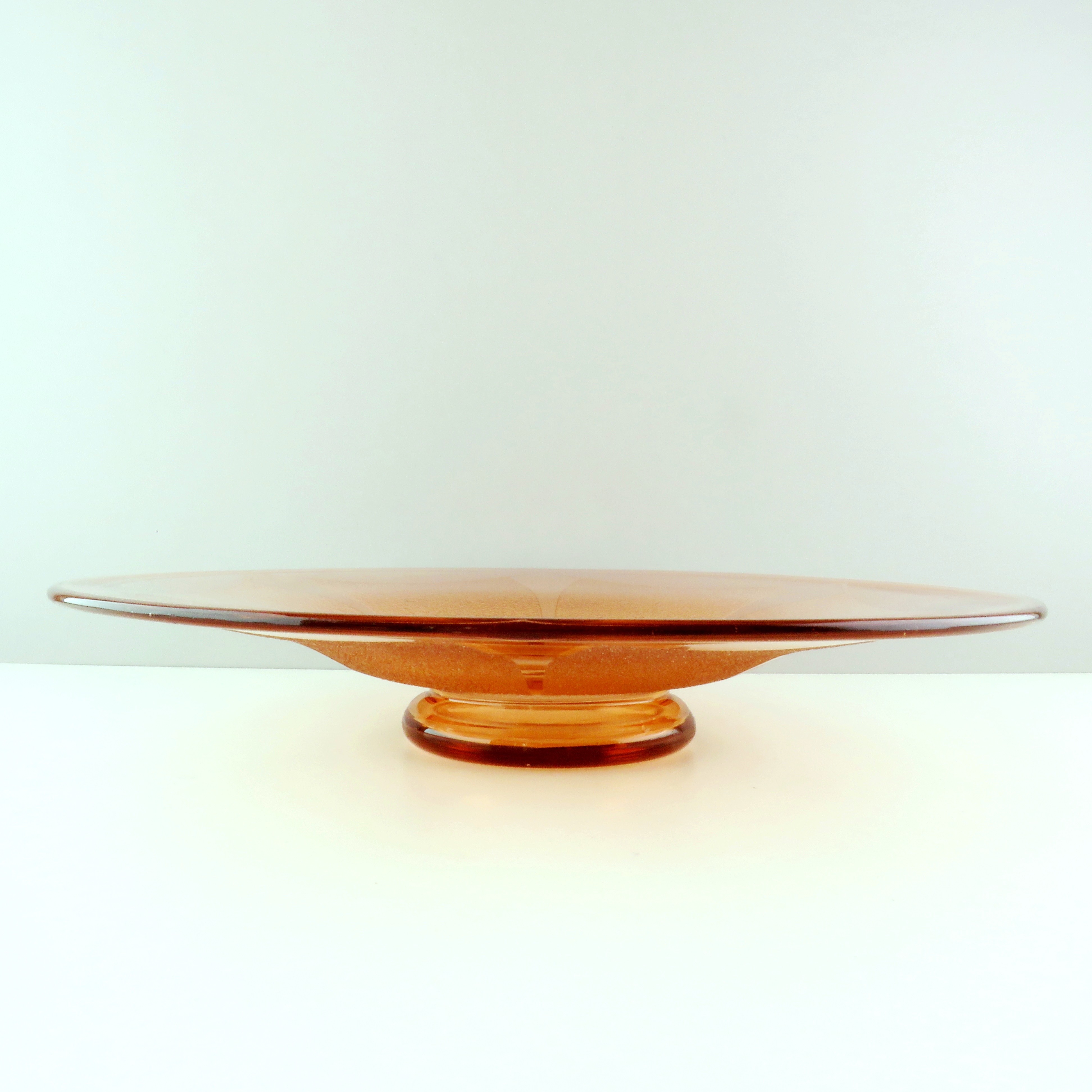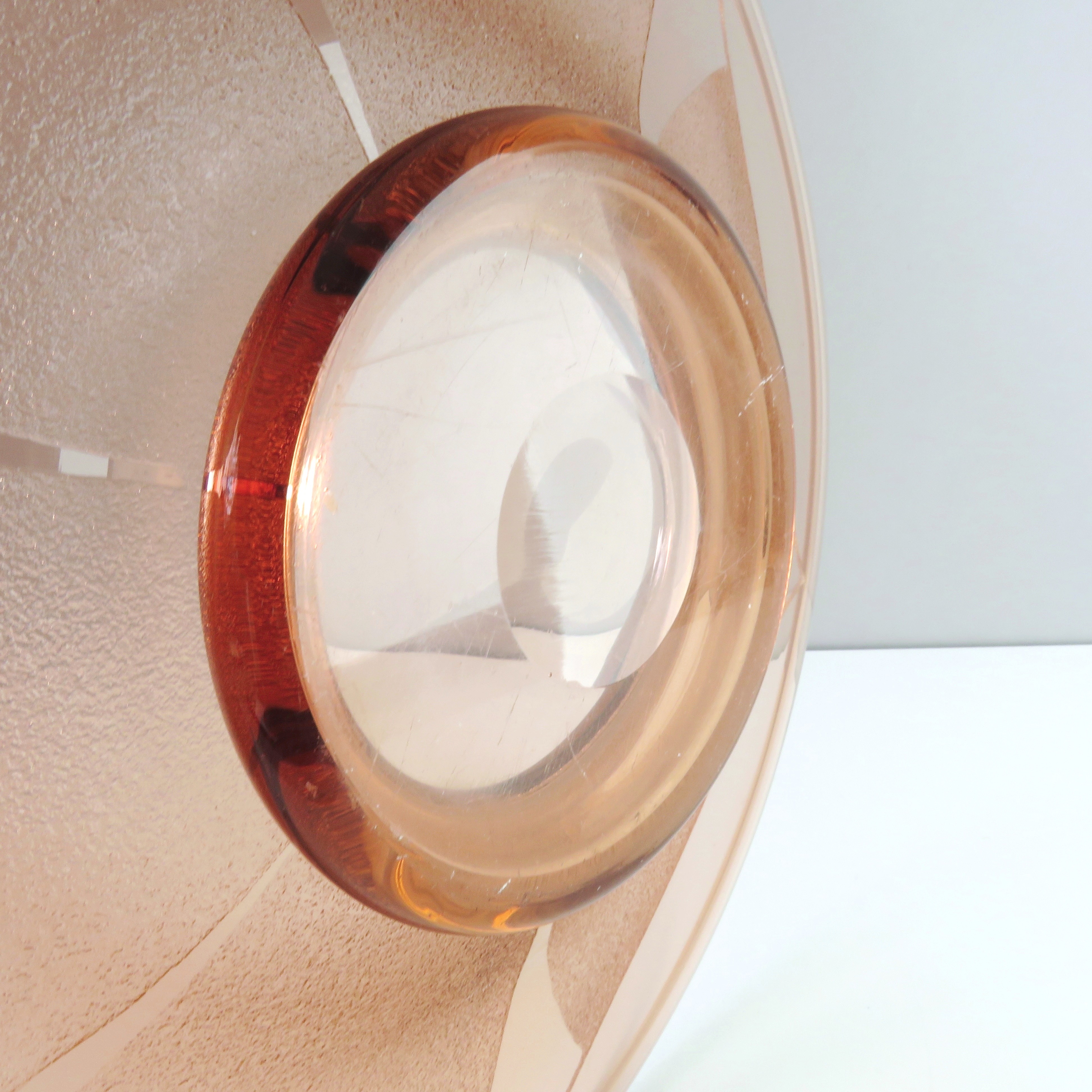 Un coupe peu profond d'une douce teinte rose pêche et orné d'un motif géométrique gravé à l'acide.