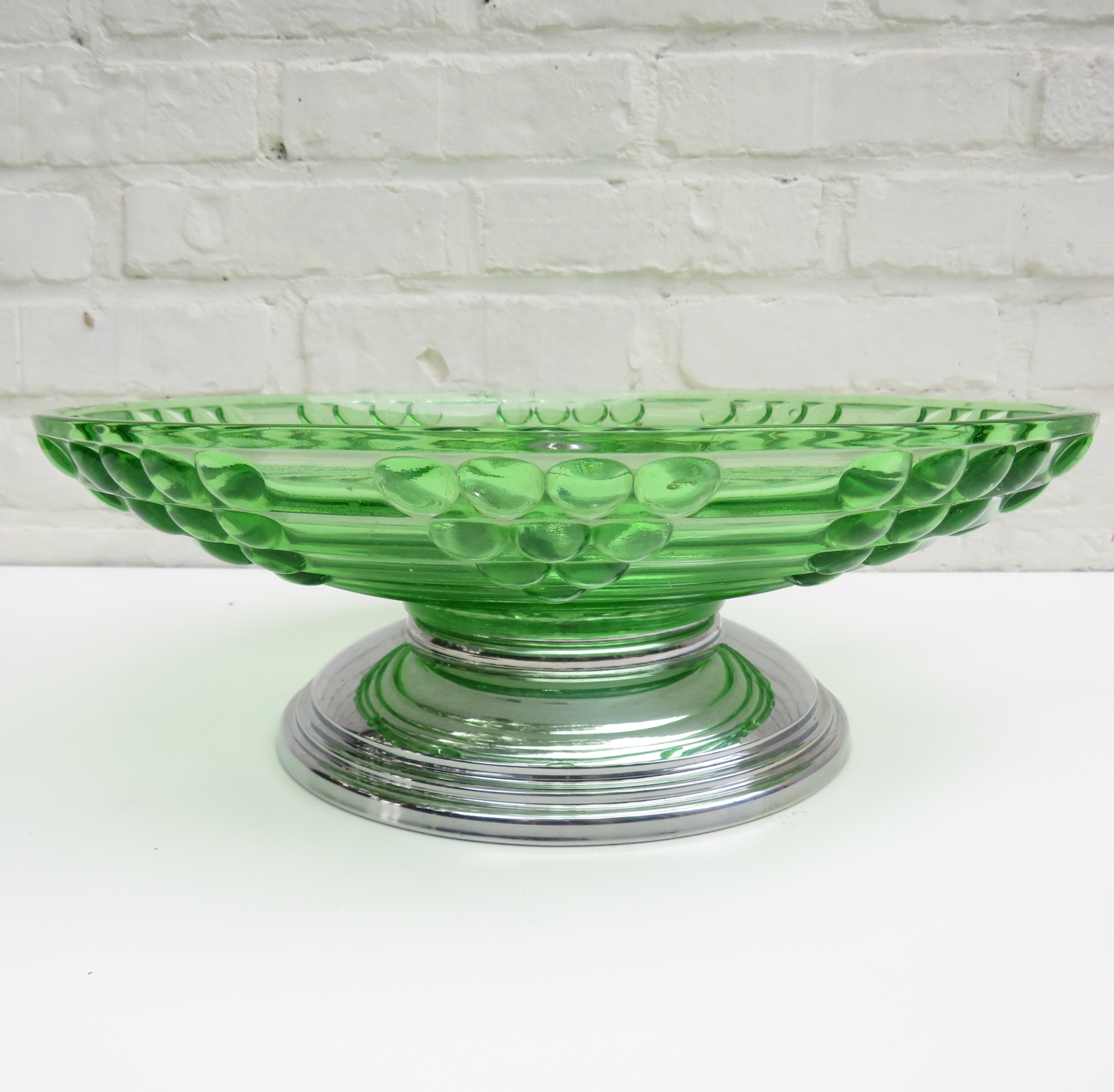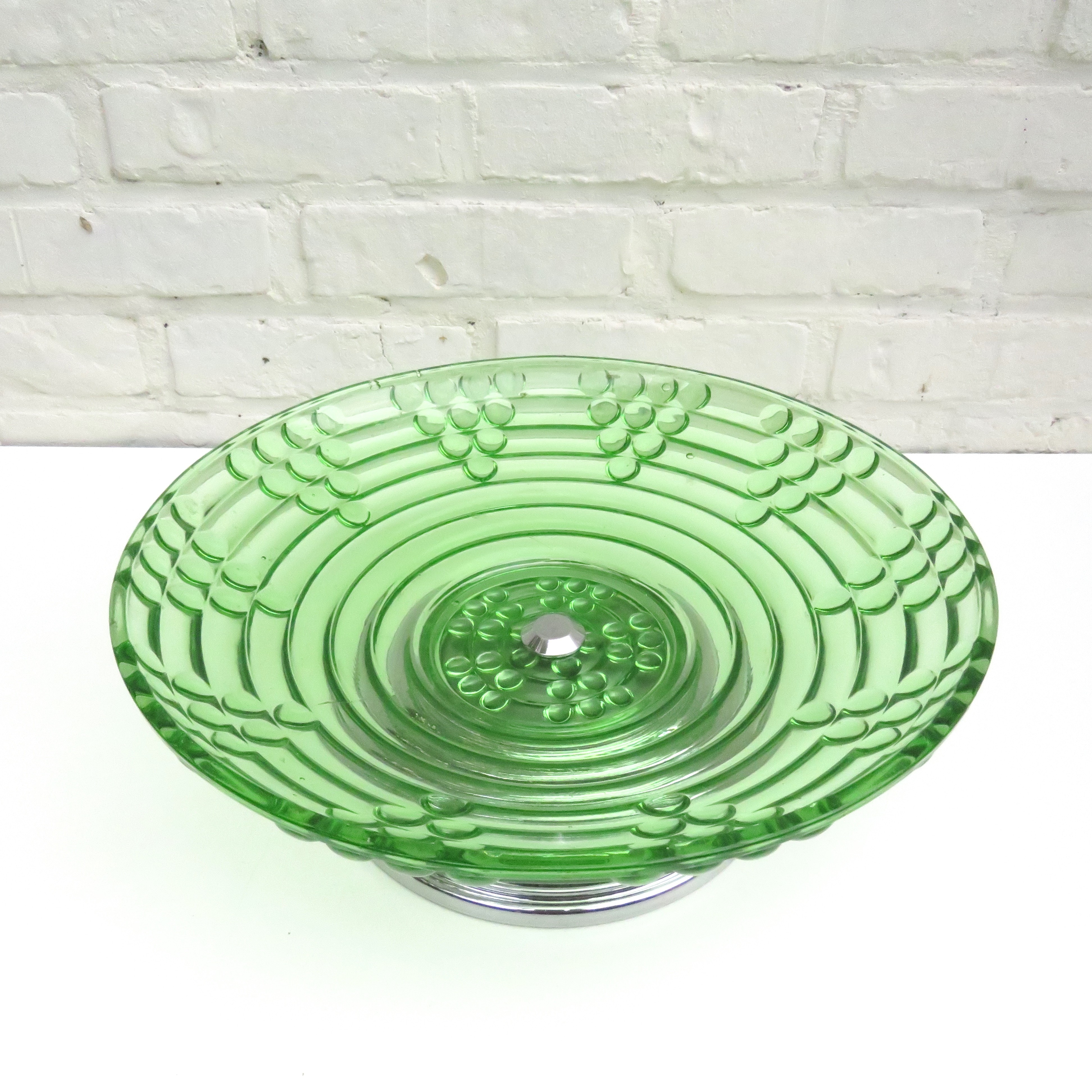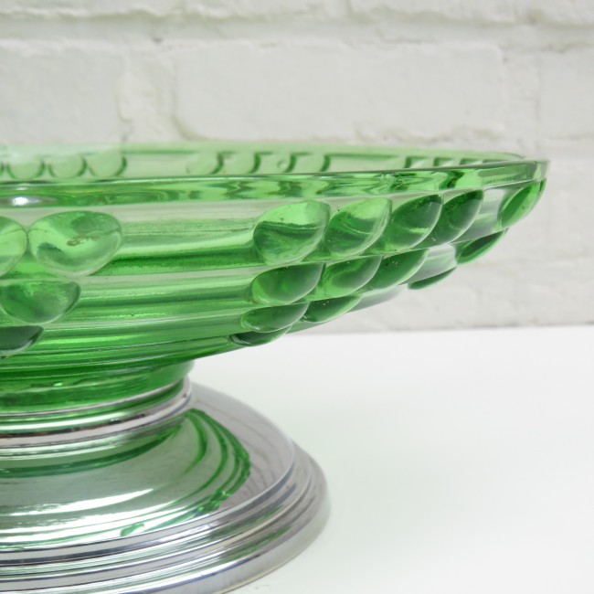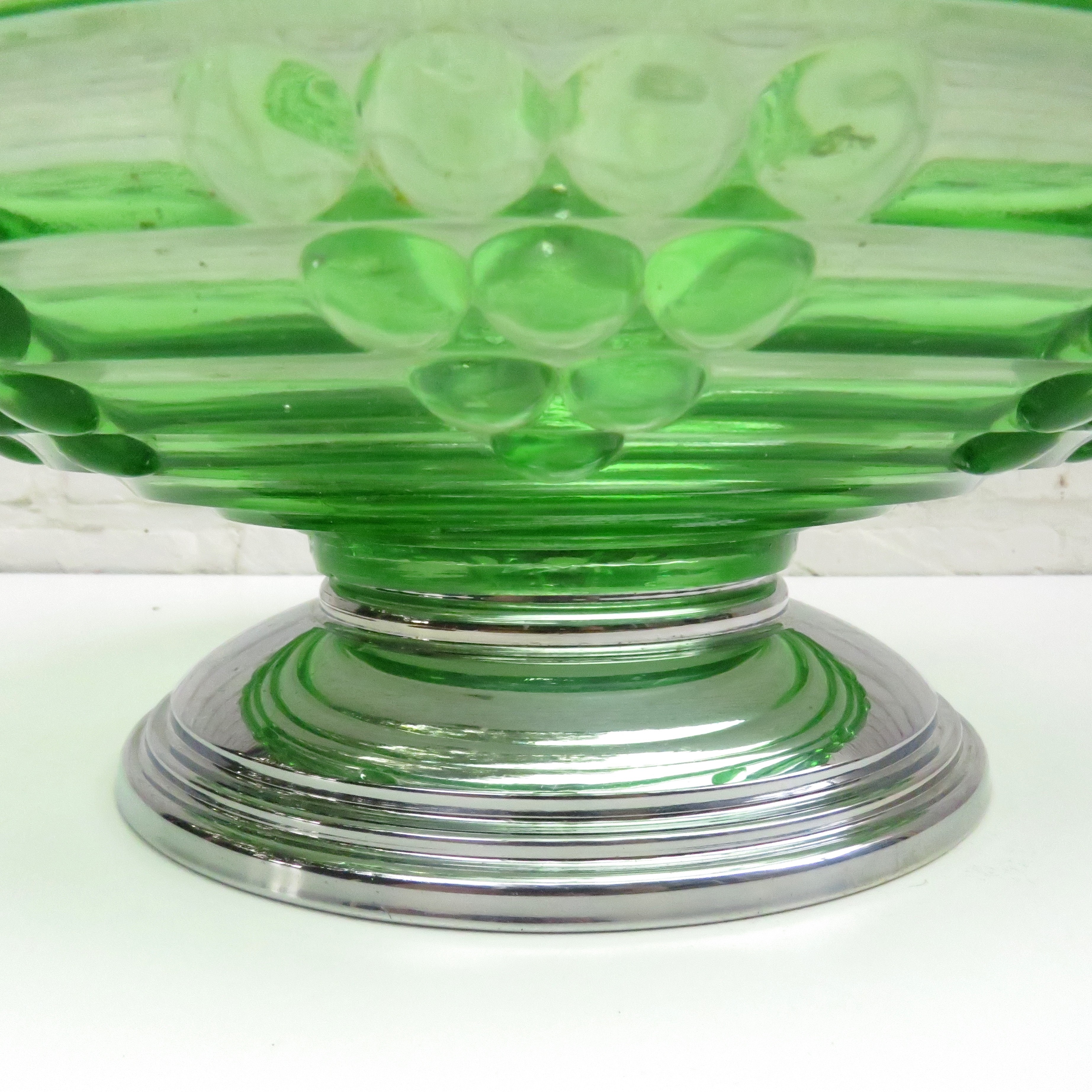 Stunning Vintage green glass fruit bowl / centerpiece with symmetric grape pattern and a chromed base.
