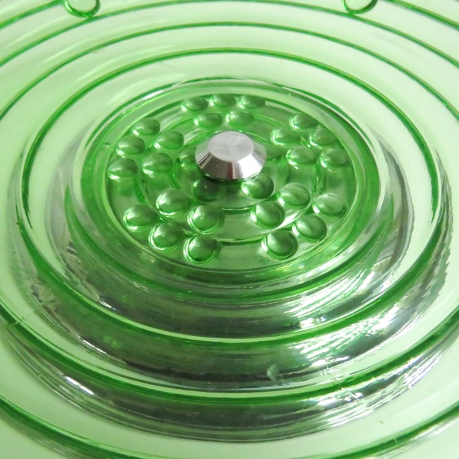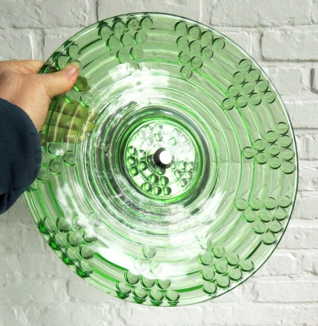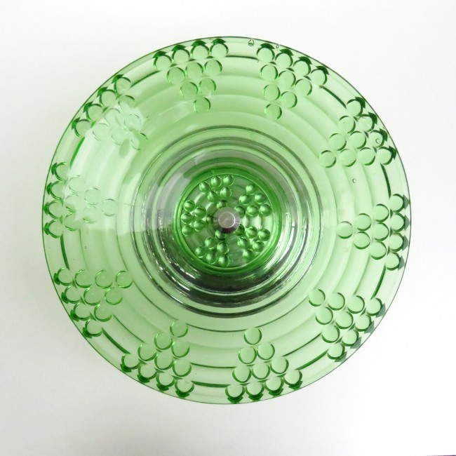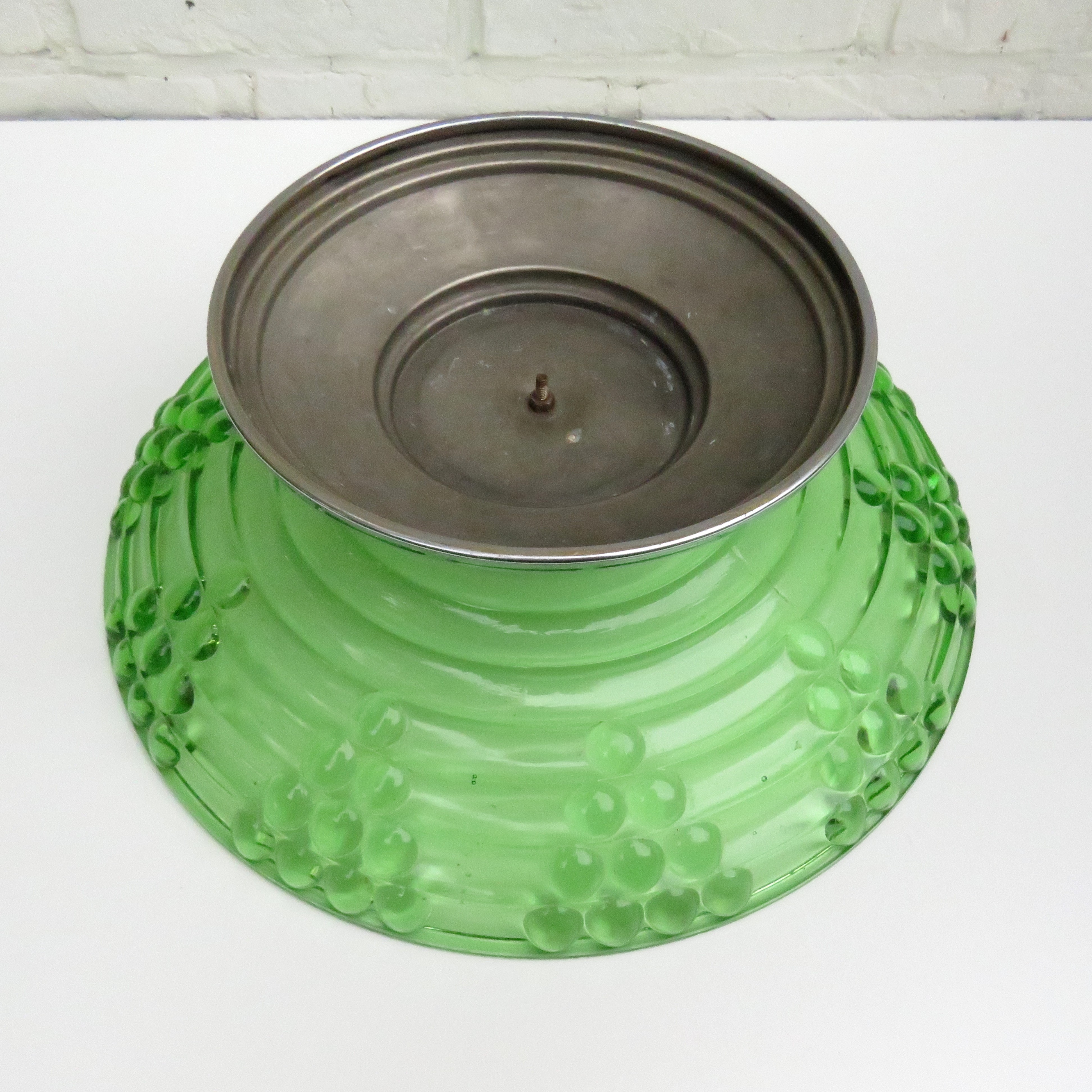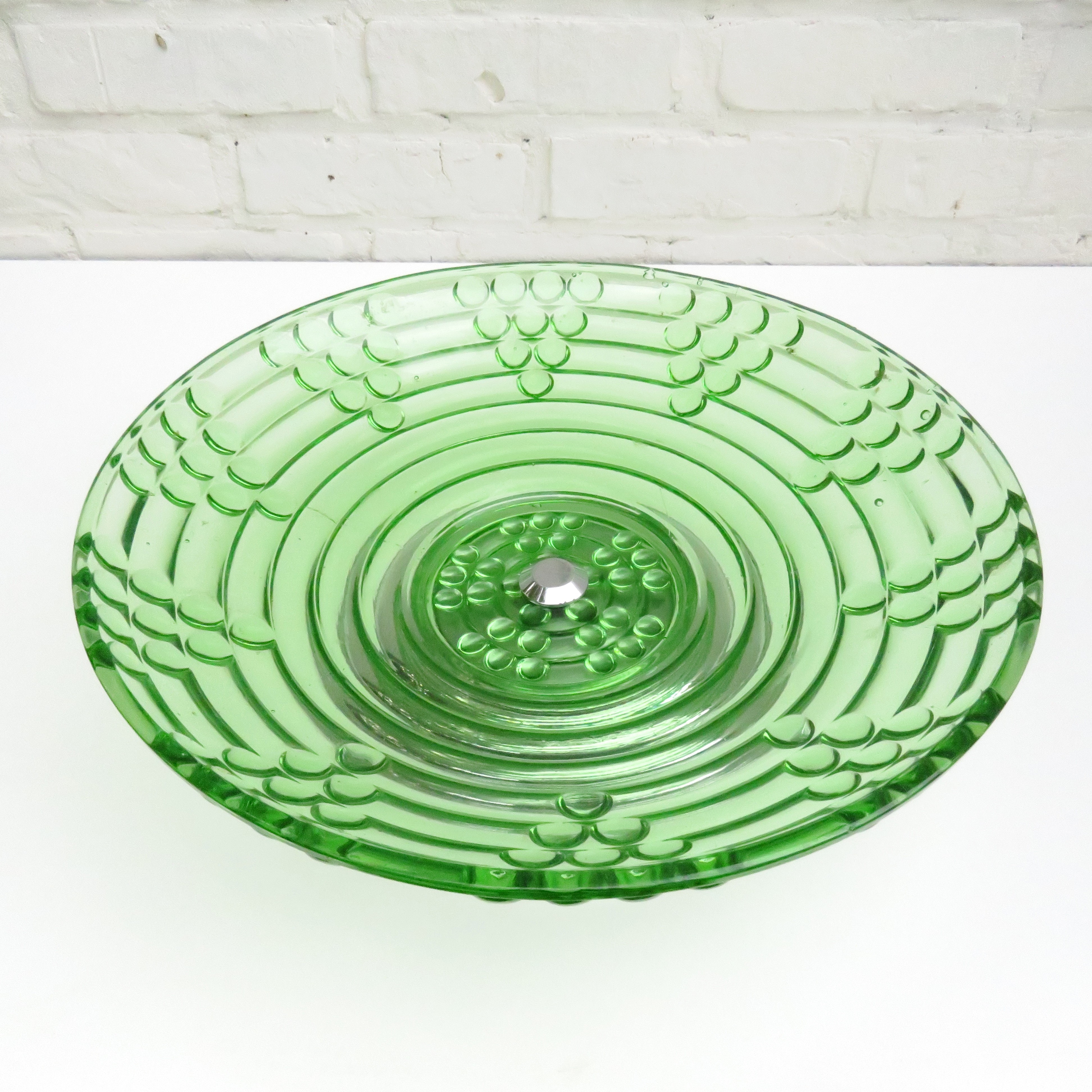 Stunning Vintage green glass fruit bowl / centerpiece with symmetric grape pattern and a chromed base.