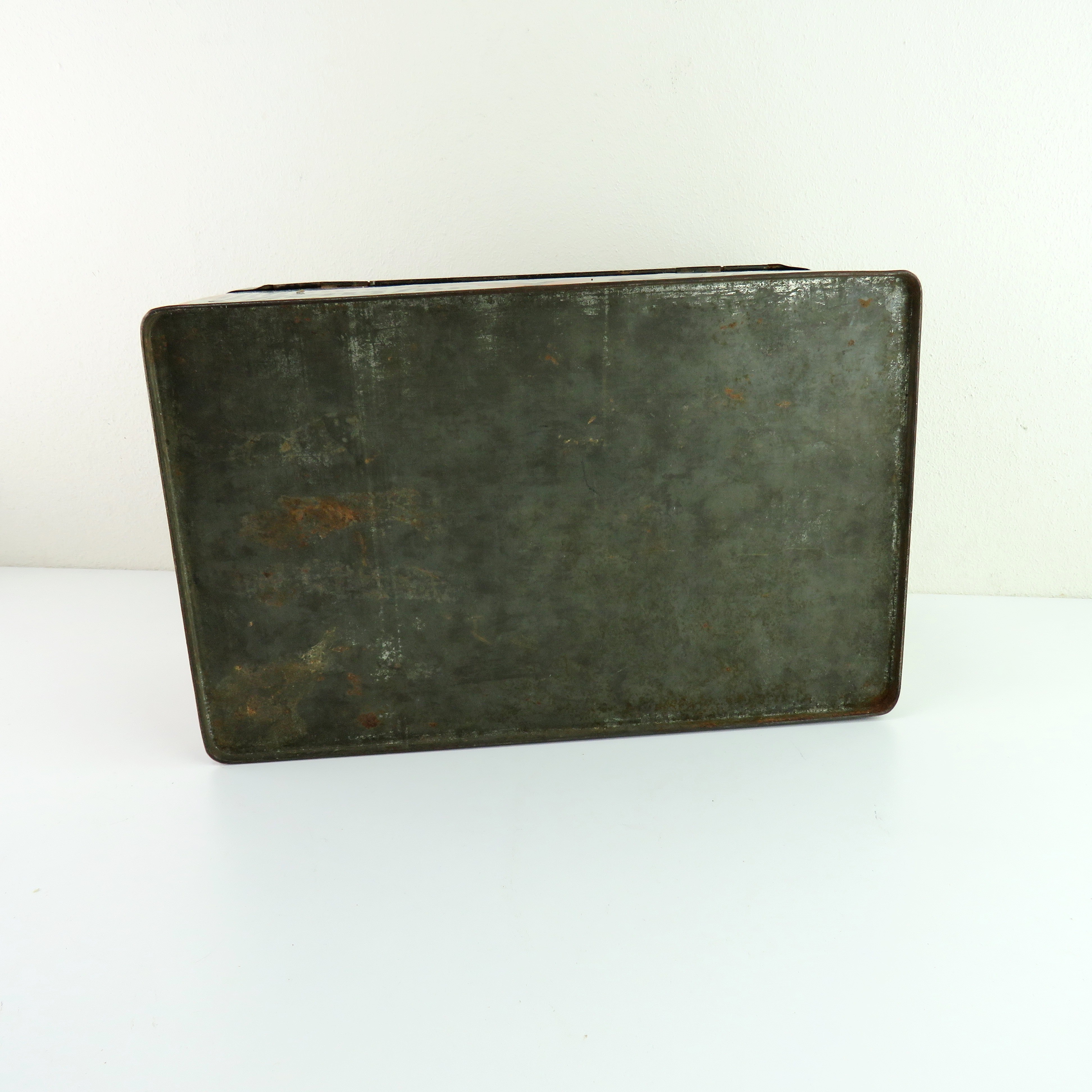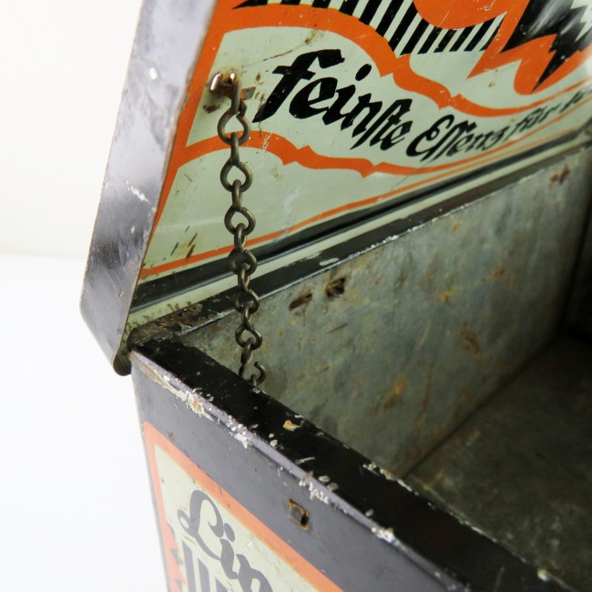 Good condition, some scratches. The lid has a chain to keep the lid from closing, the chain is partly broken off.