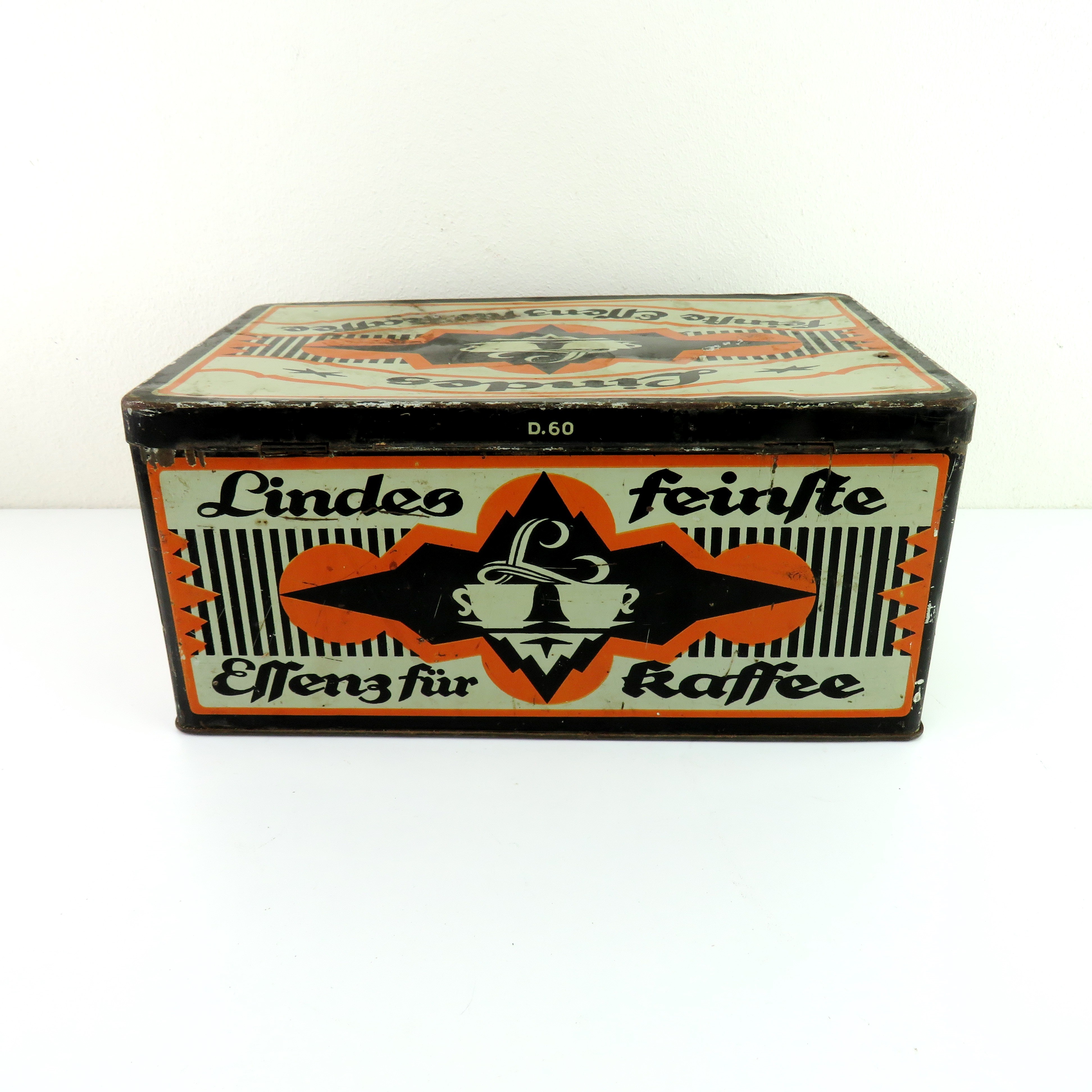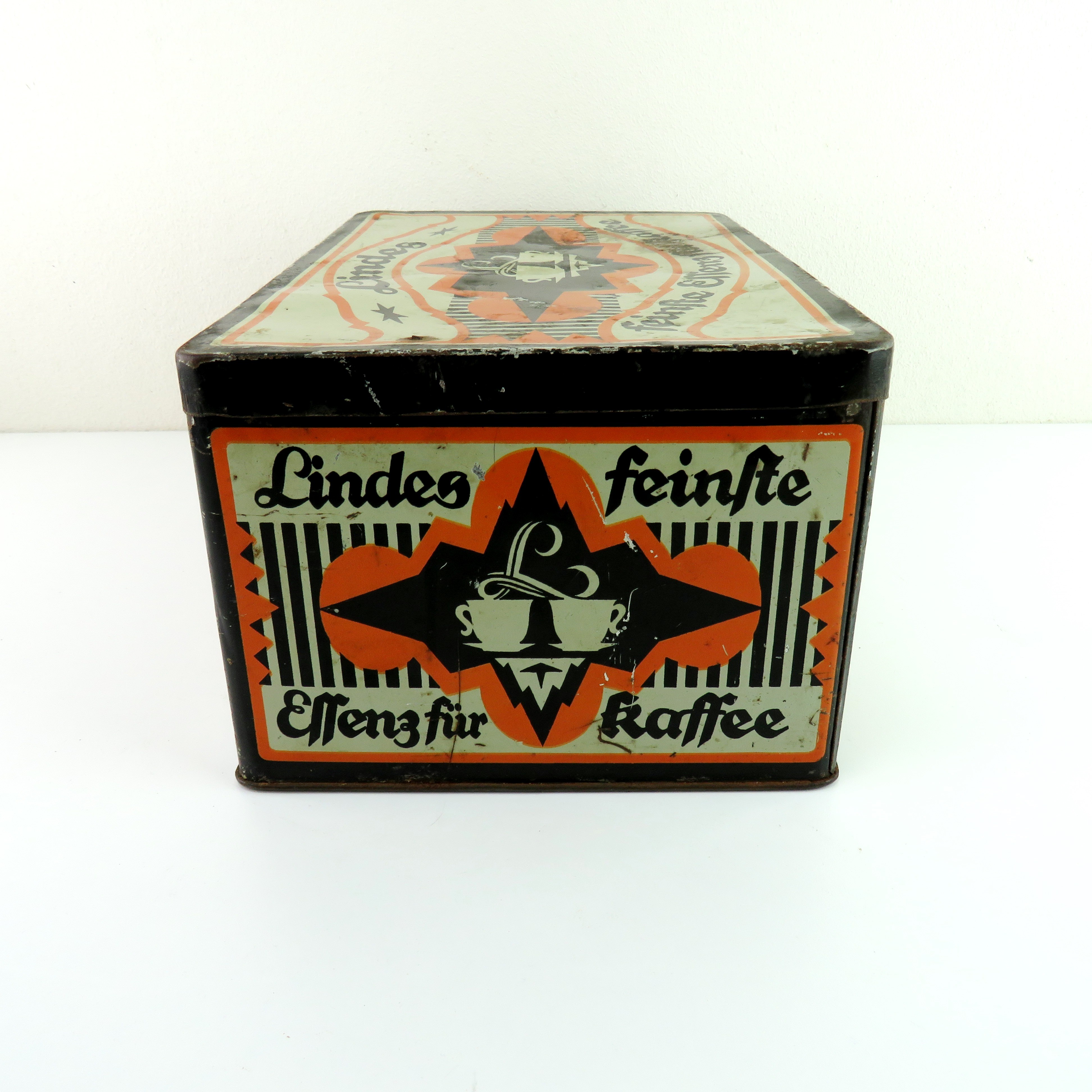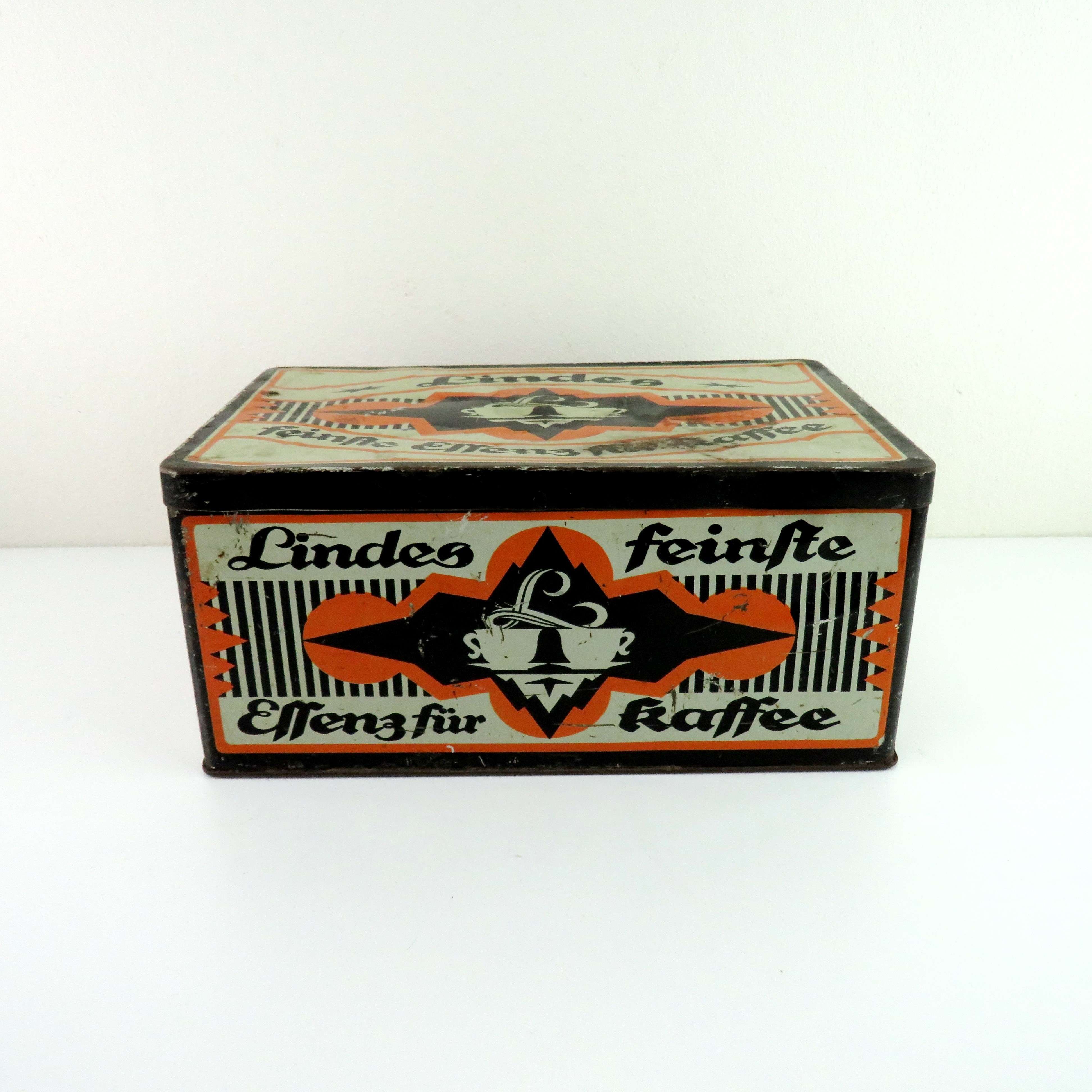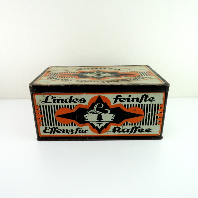 Rare boîte en fer-blanc de Linde's Kaffee, au magnifique design Art déco.