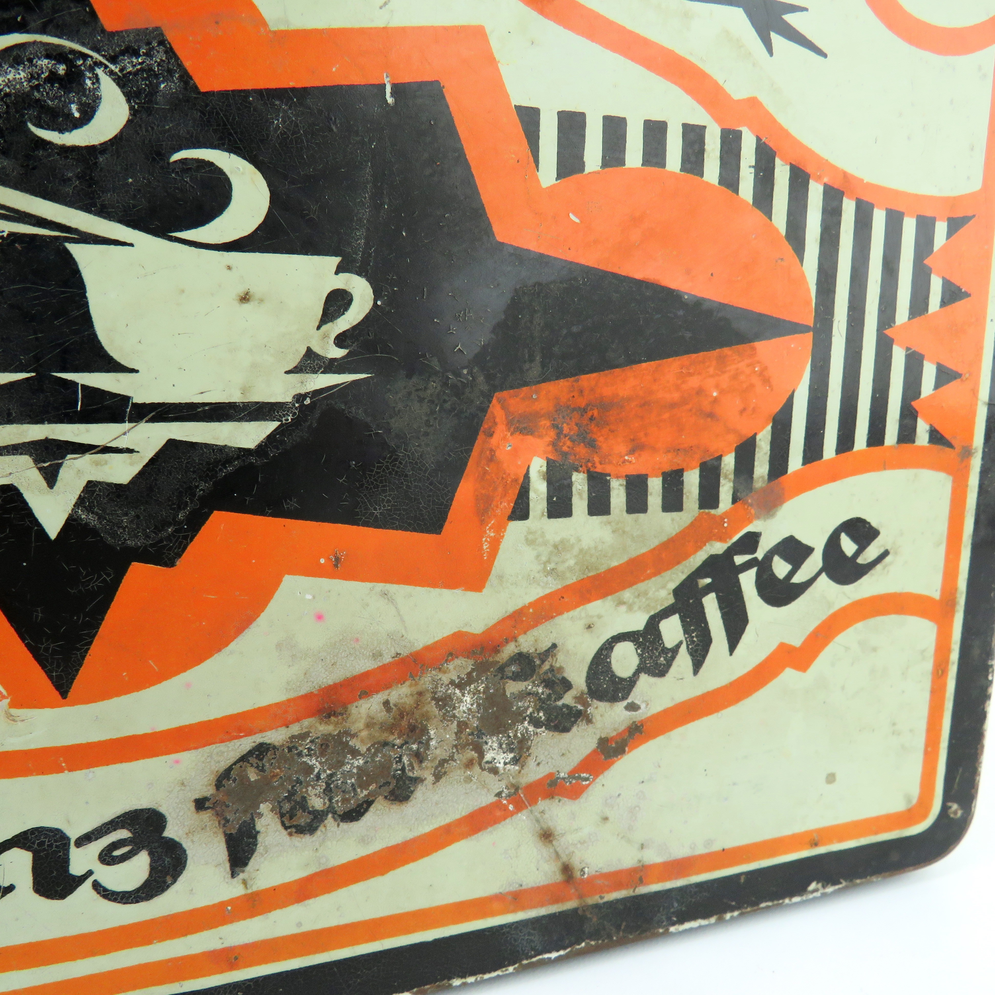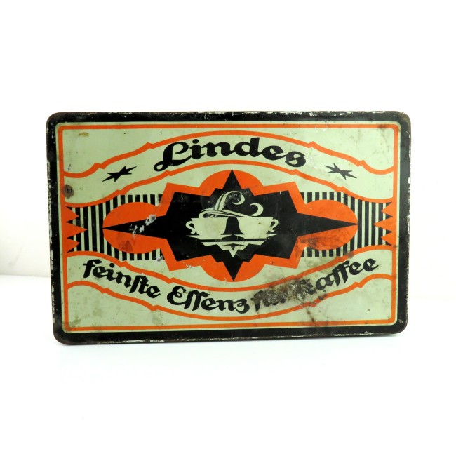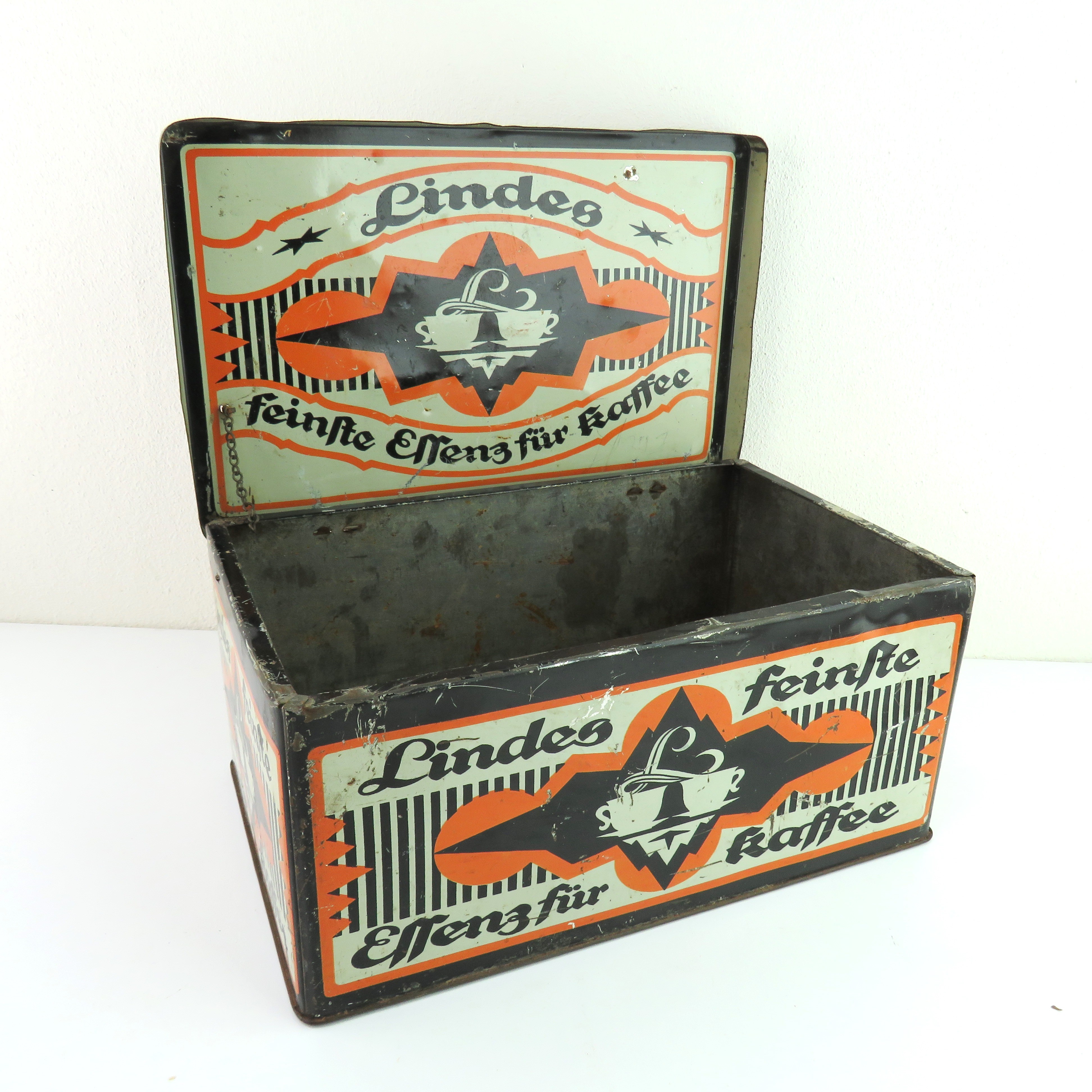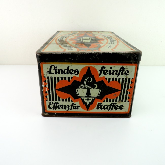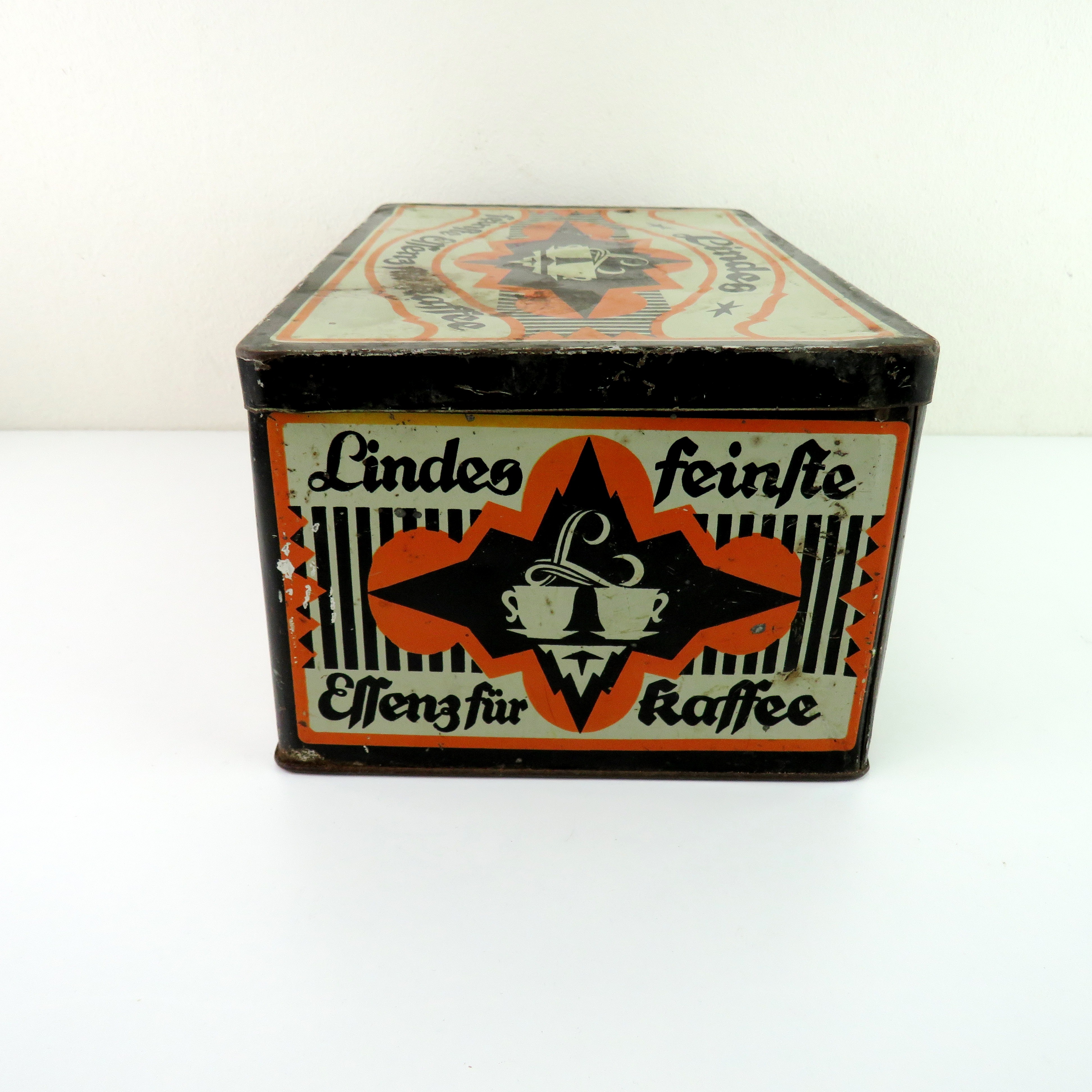 Rare boîte en fer-blanc de Linde's Kaffee, au magnifique design Art déco.