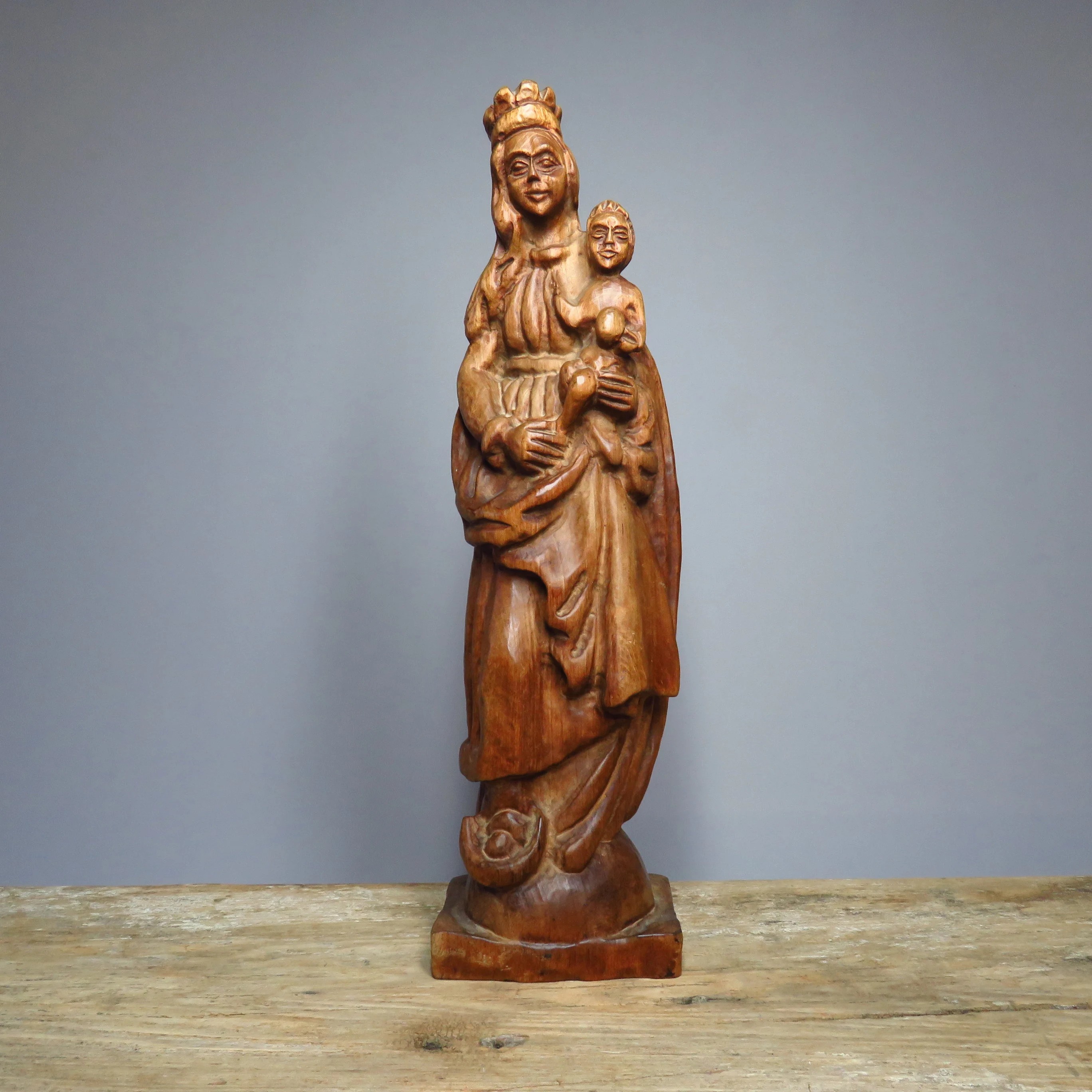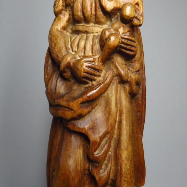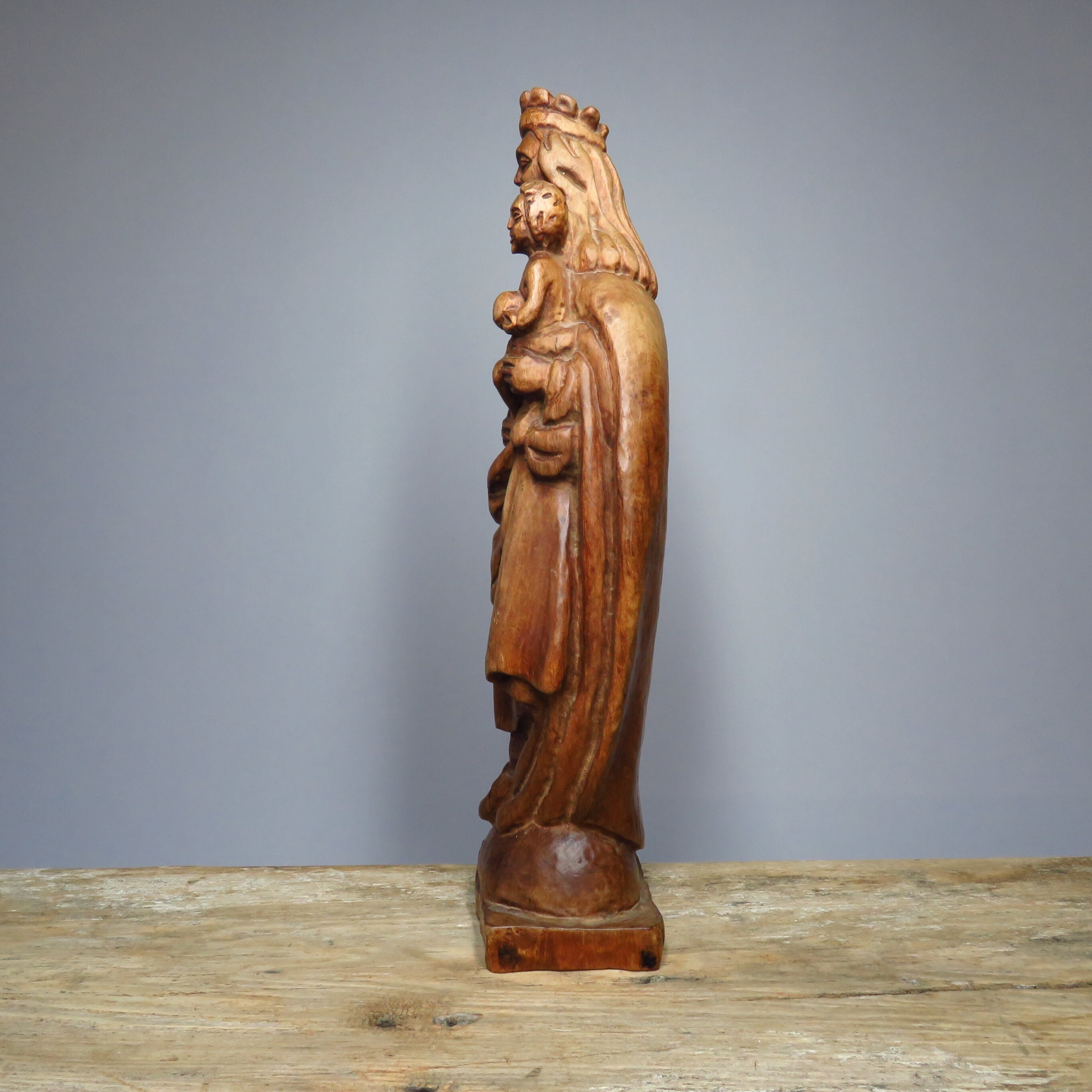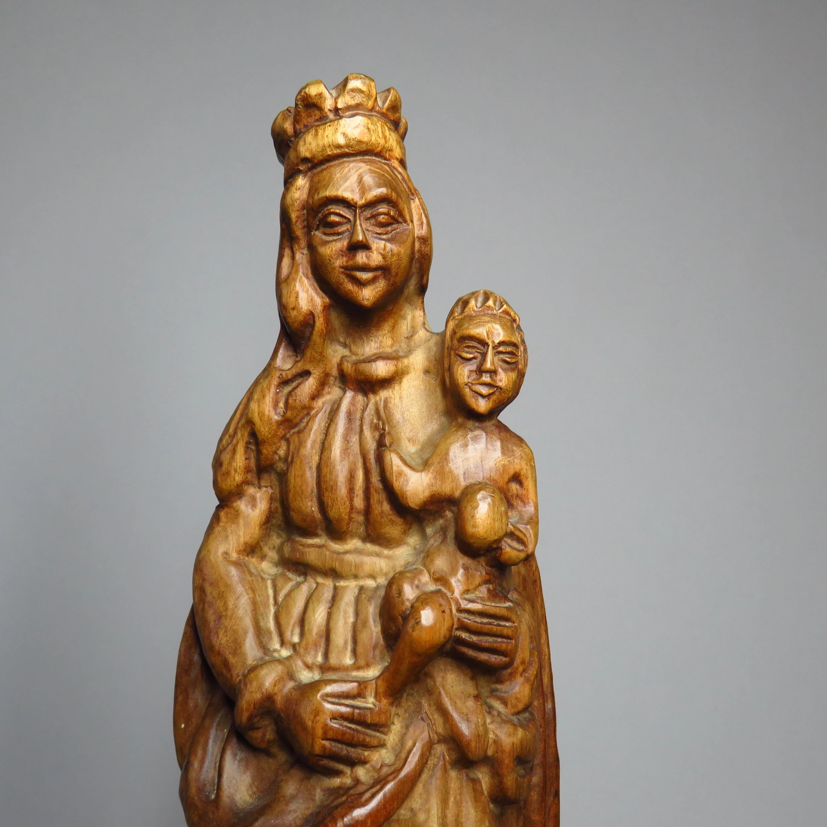 Vintage handmade wooden Madonna with child figurine.