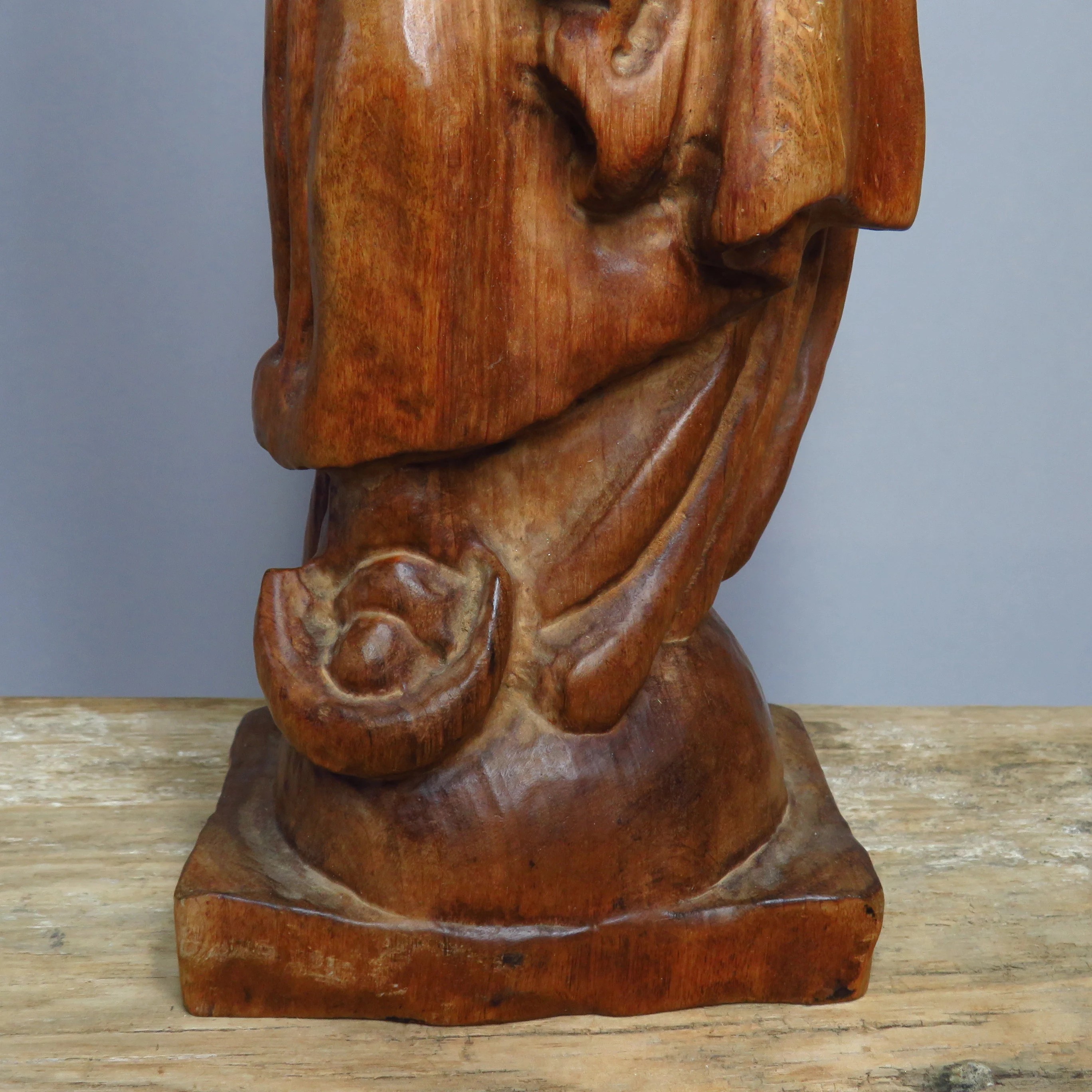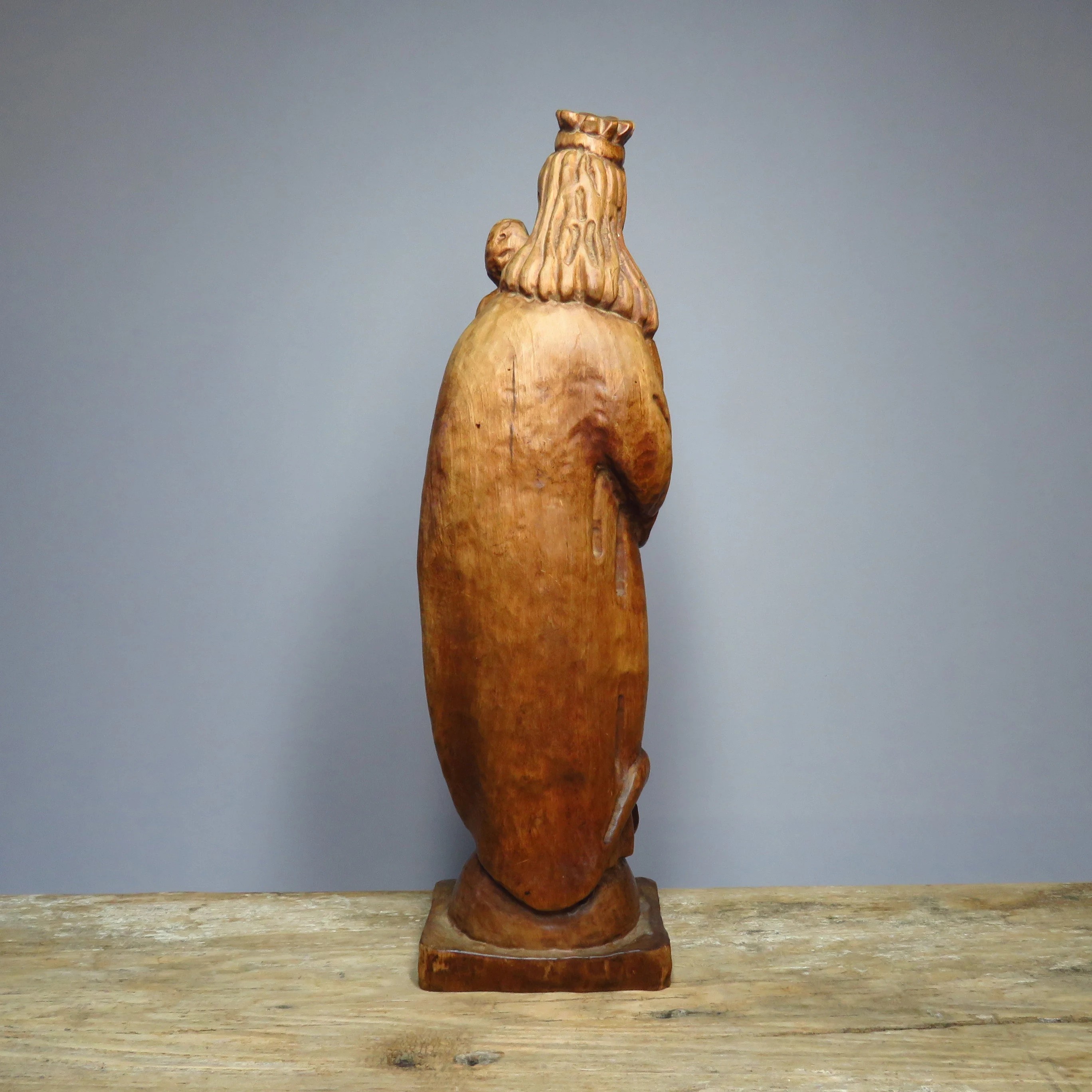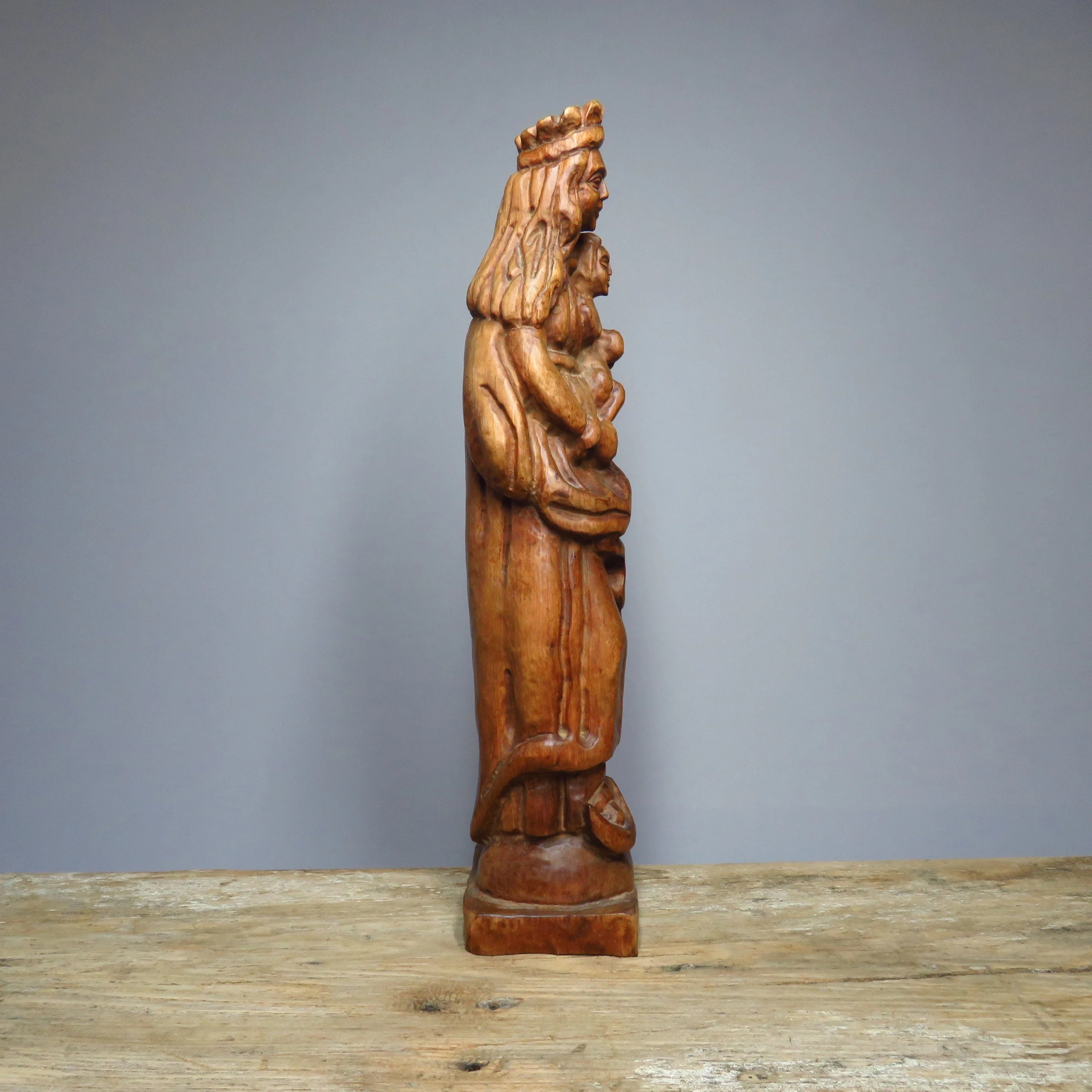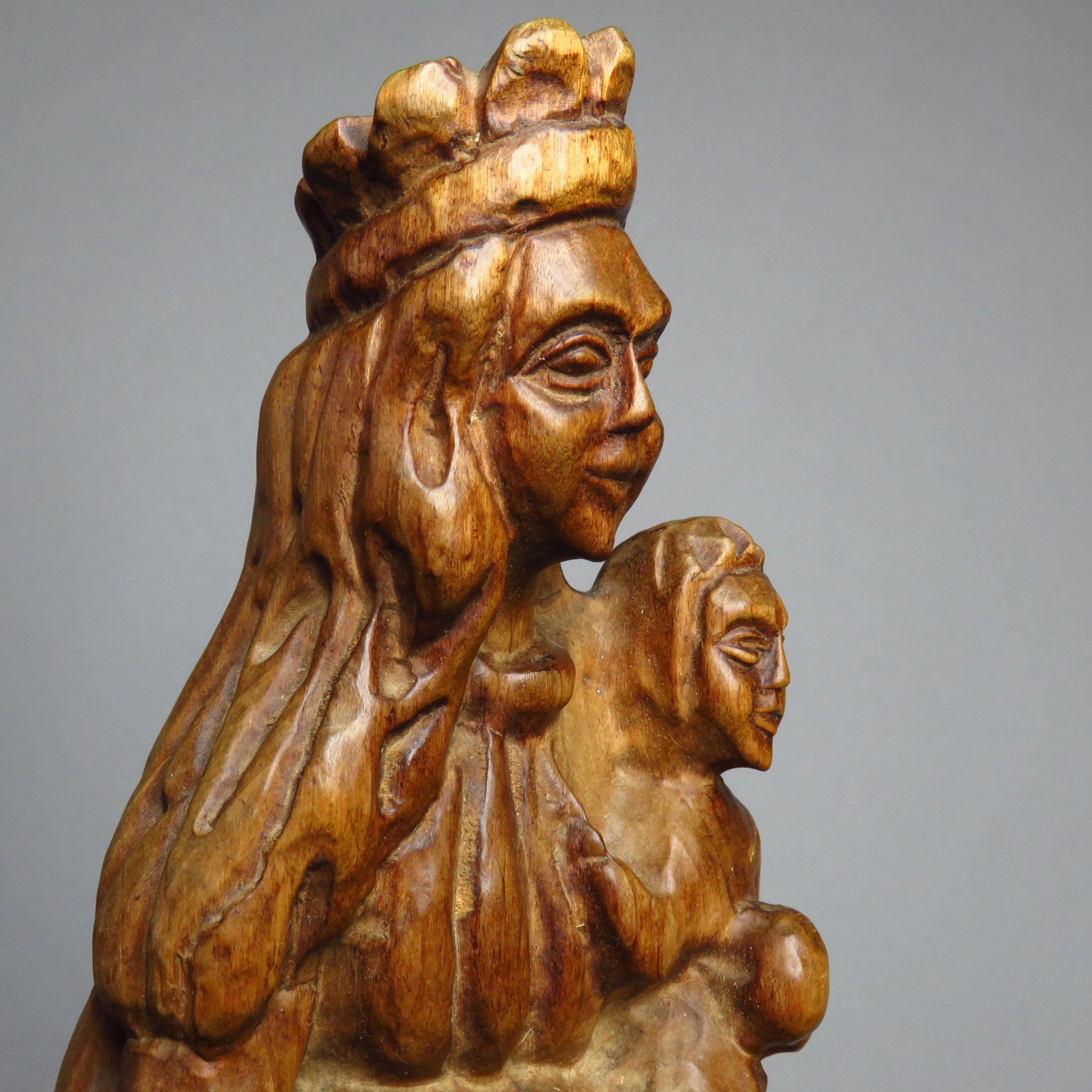 Vintage handmade wooden Madonna with child figurine.