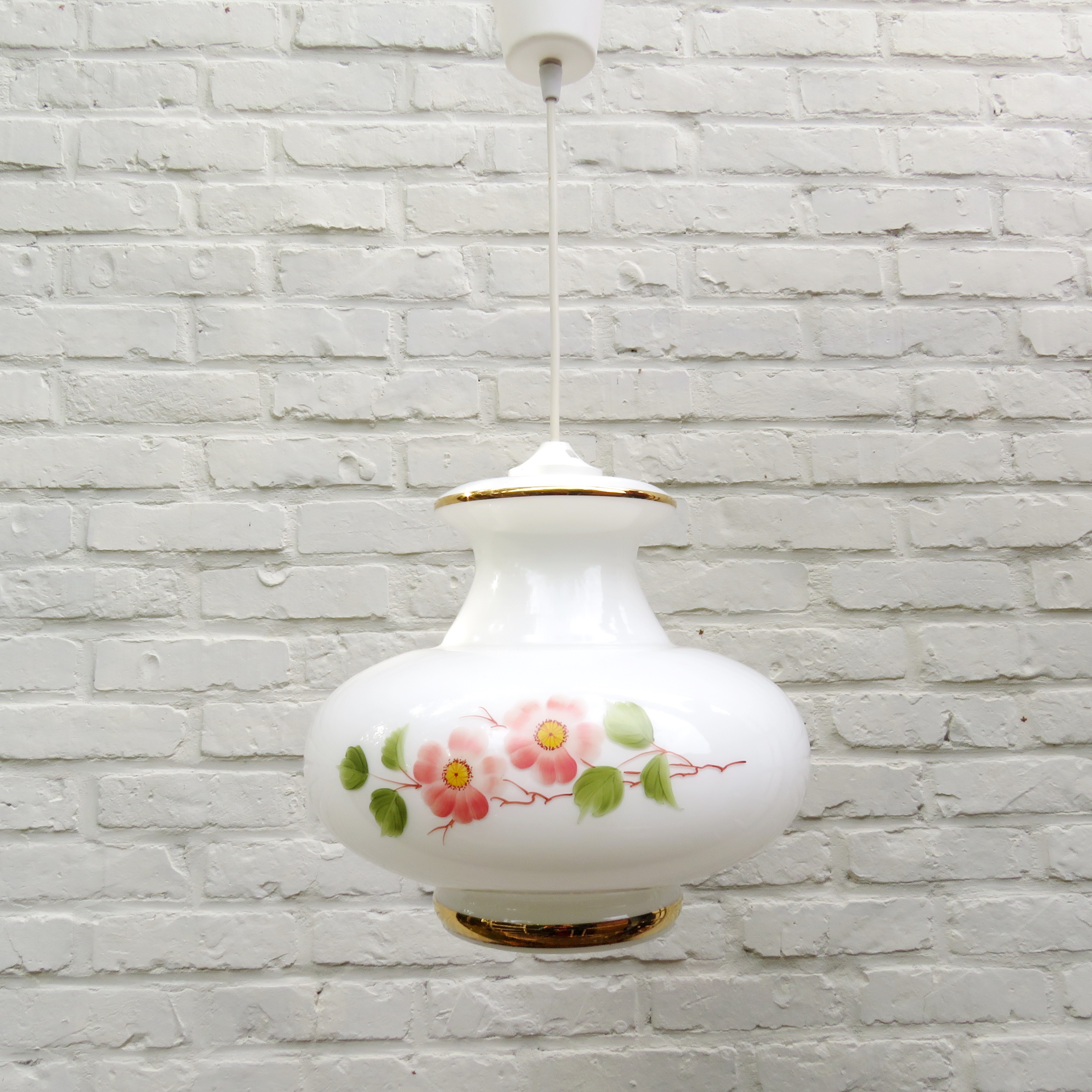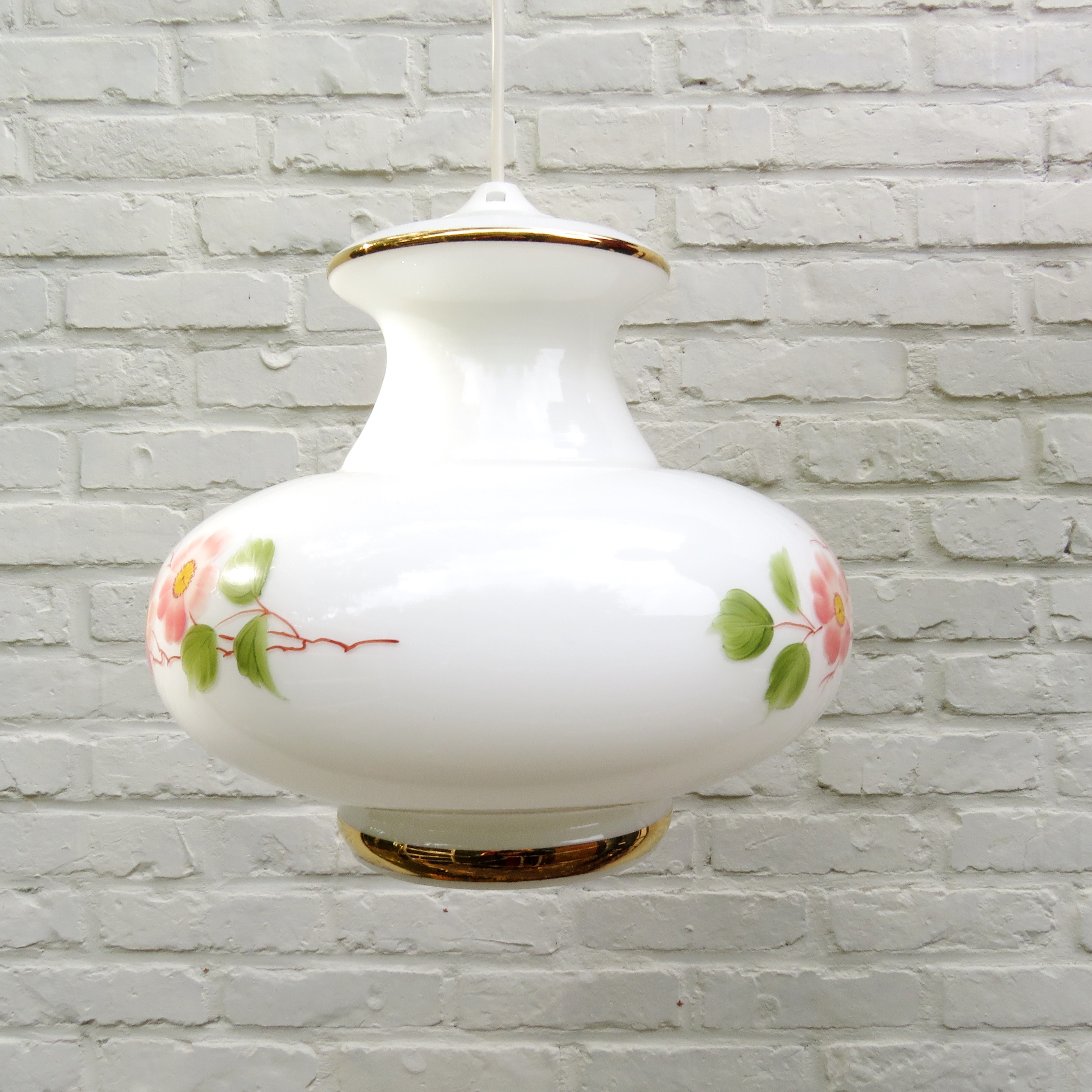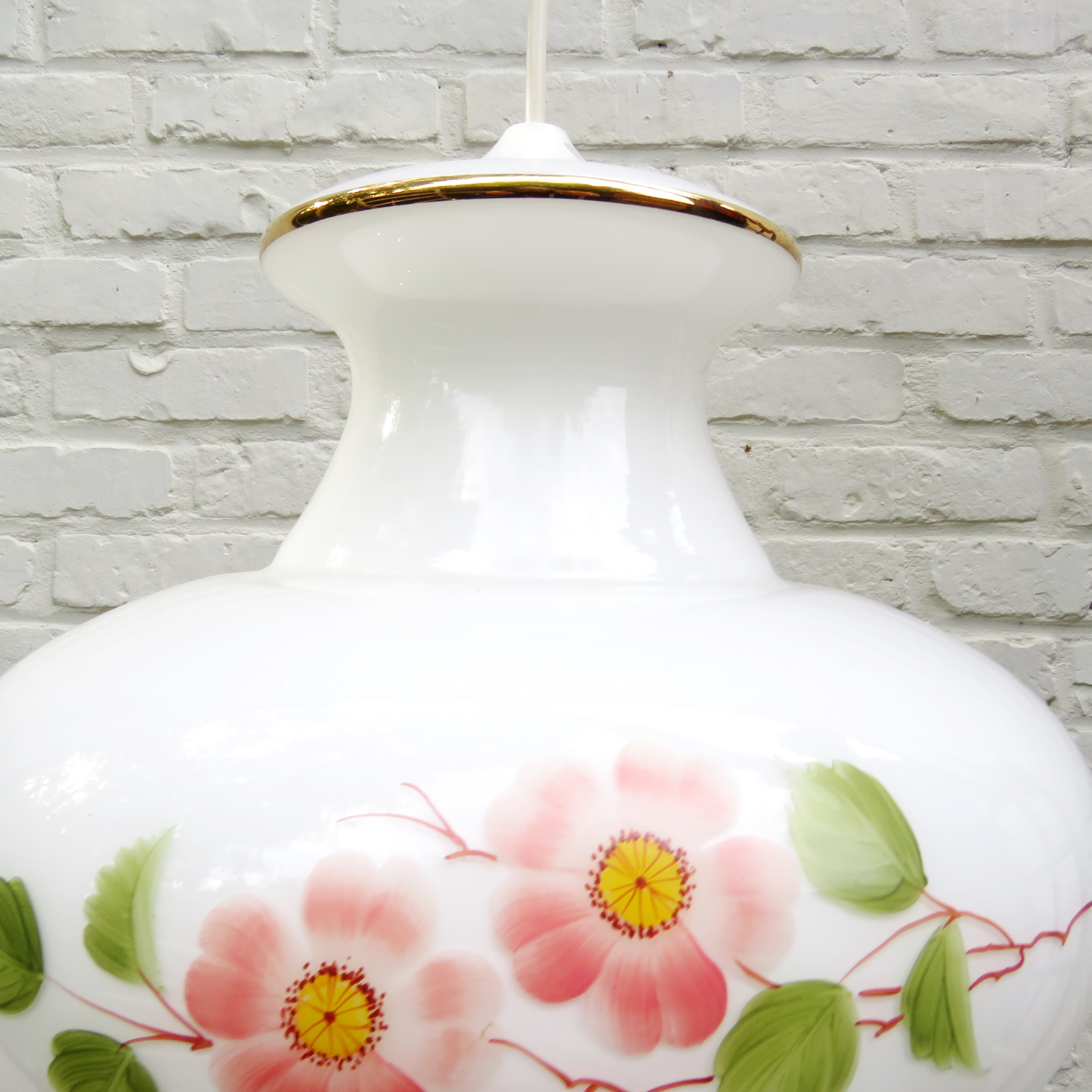 Vintage Suspension en verre opalin blanc à décor floral