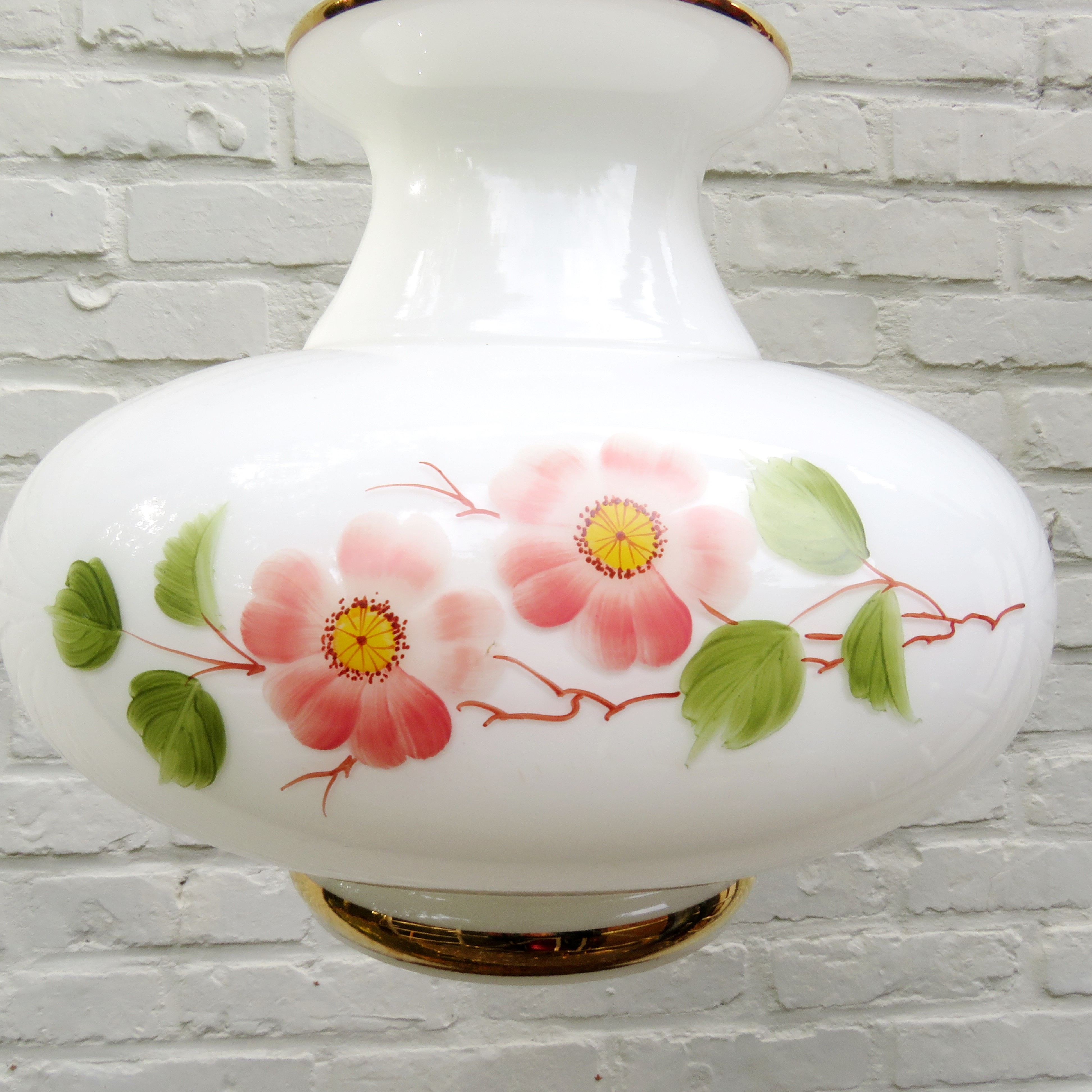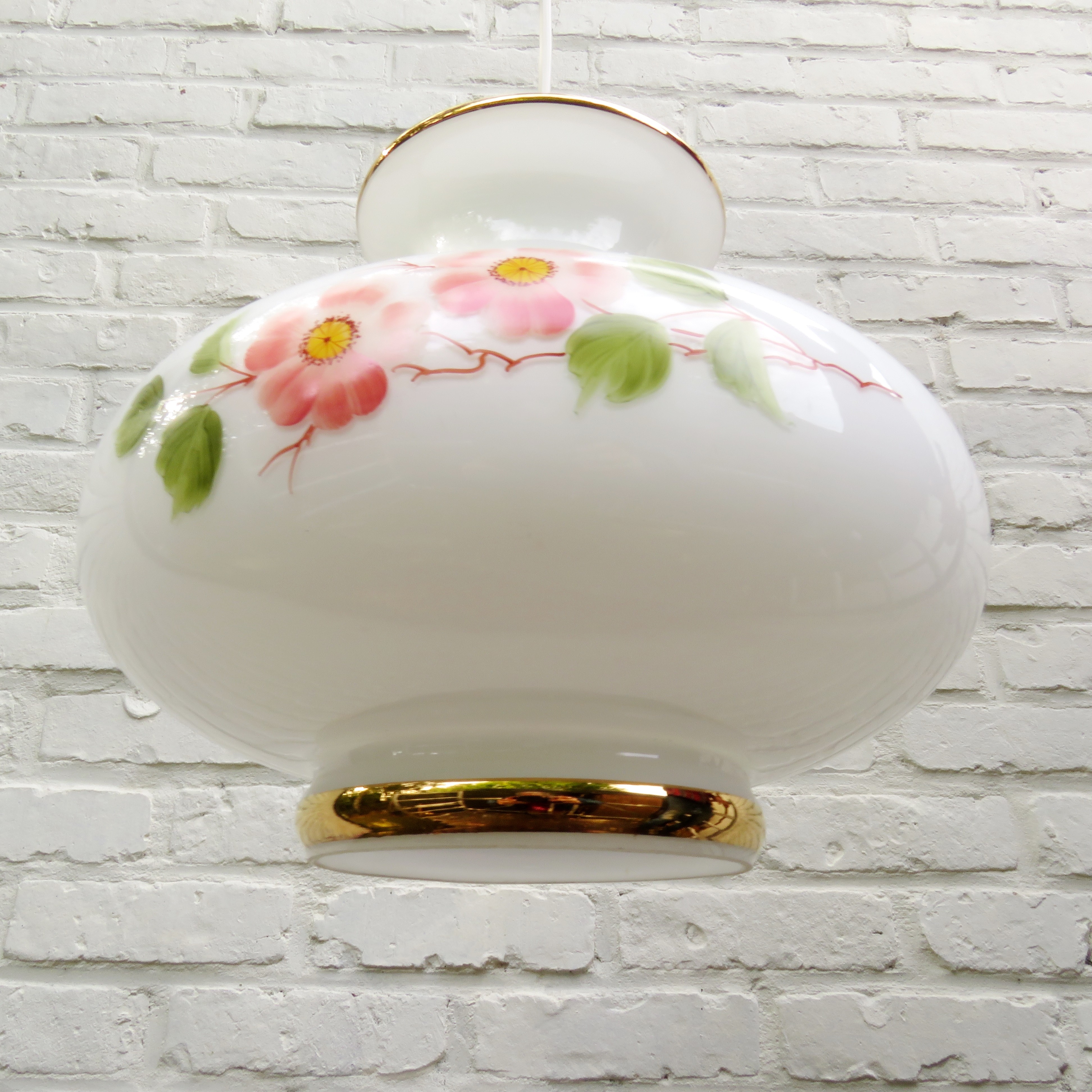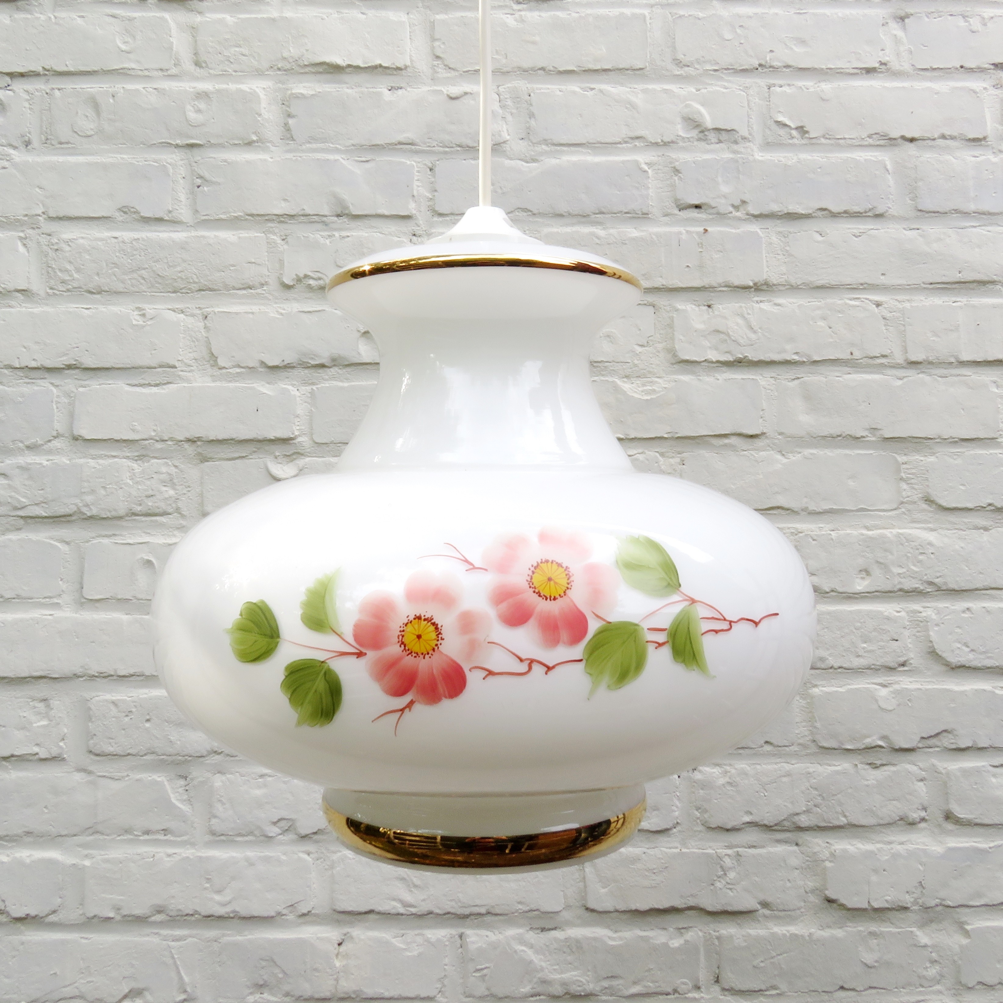 Vintage Suspension en verre opalin blanc à décor floral