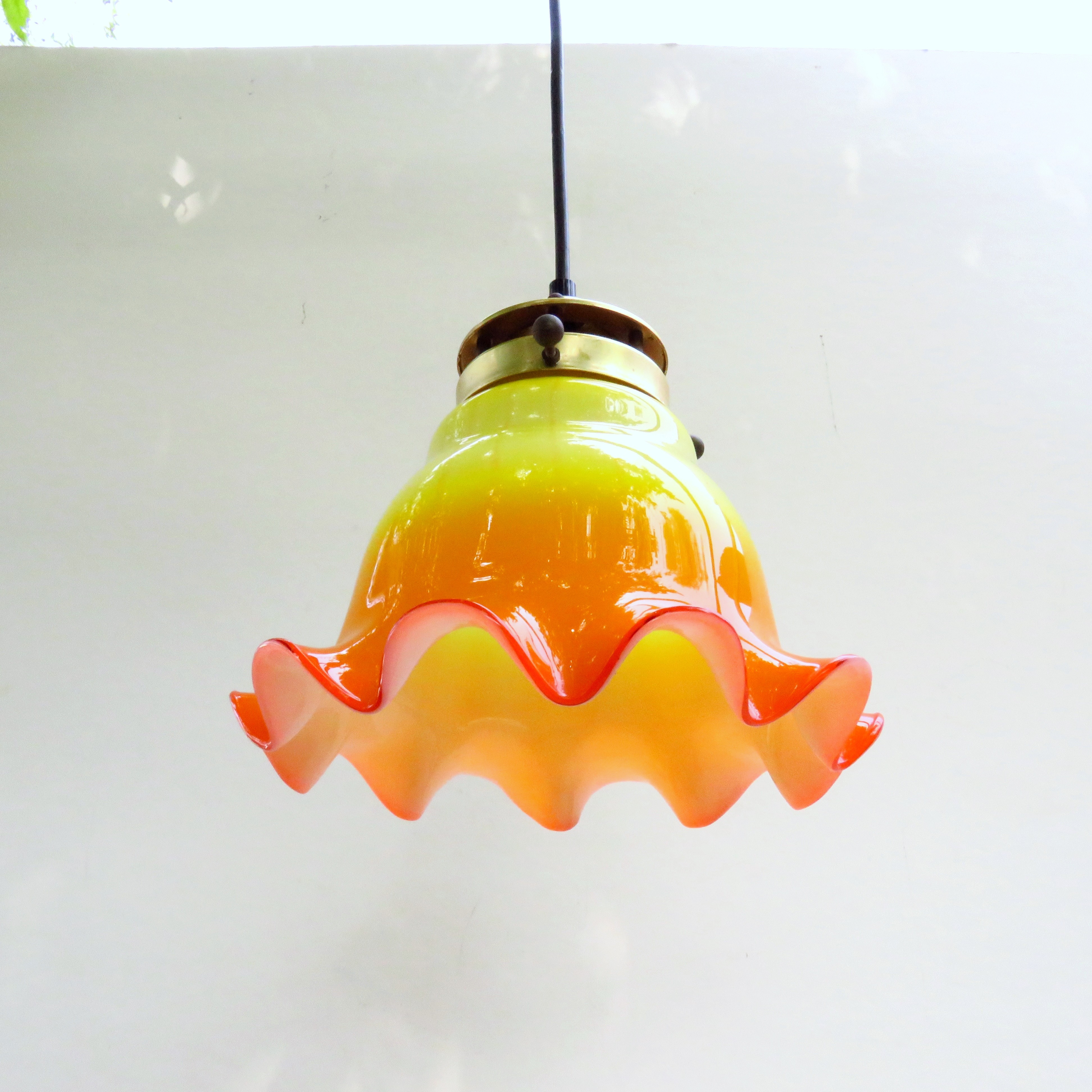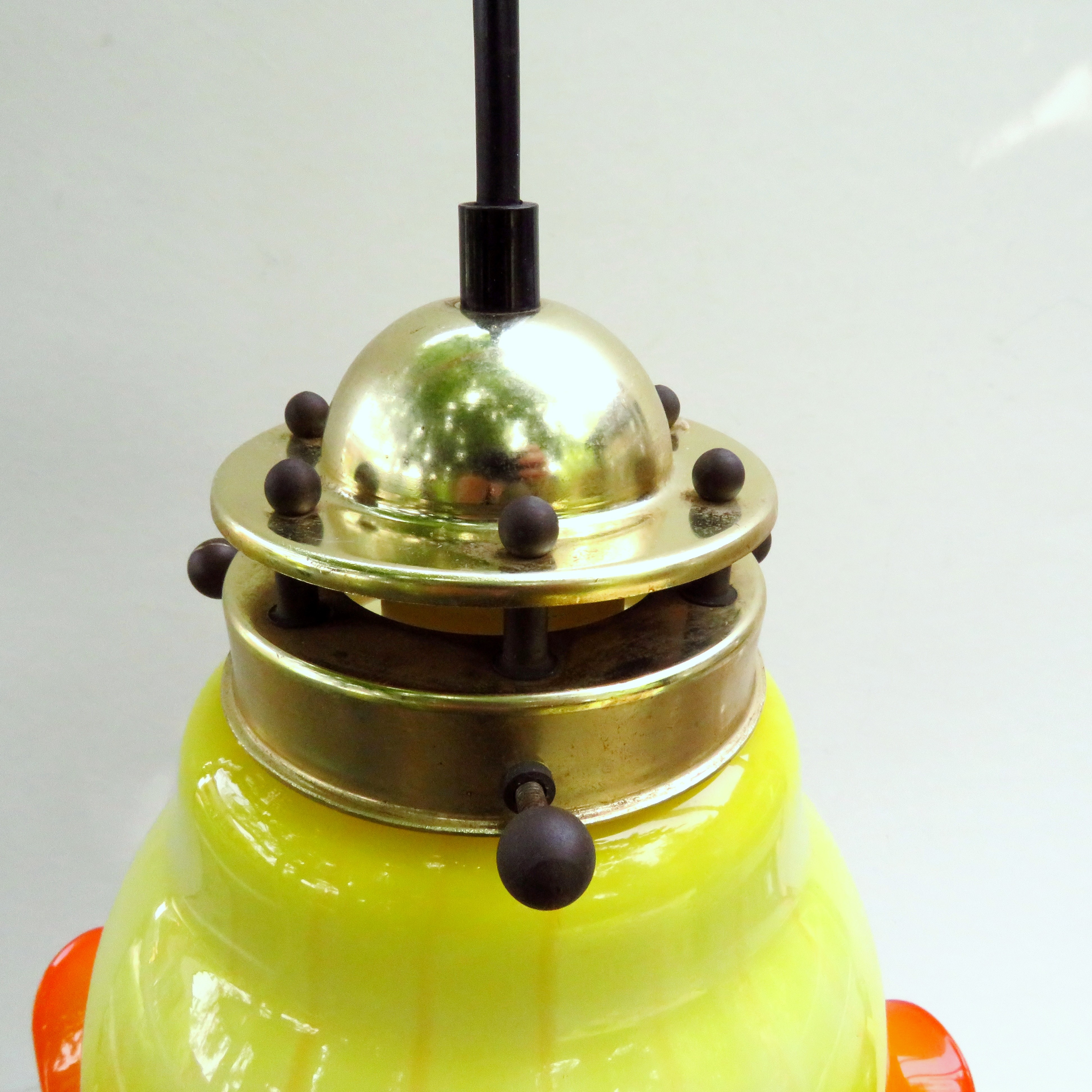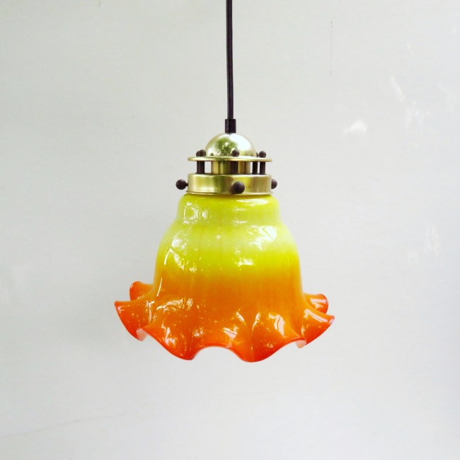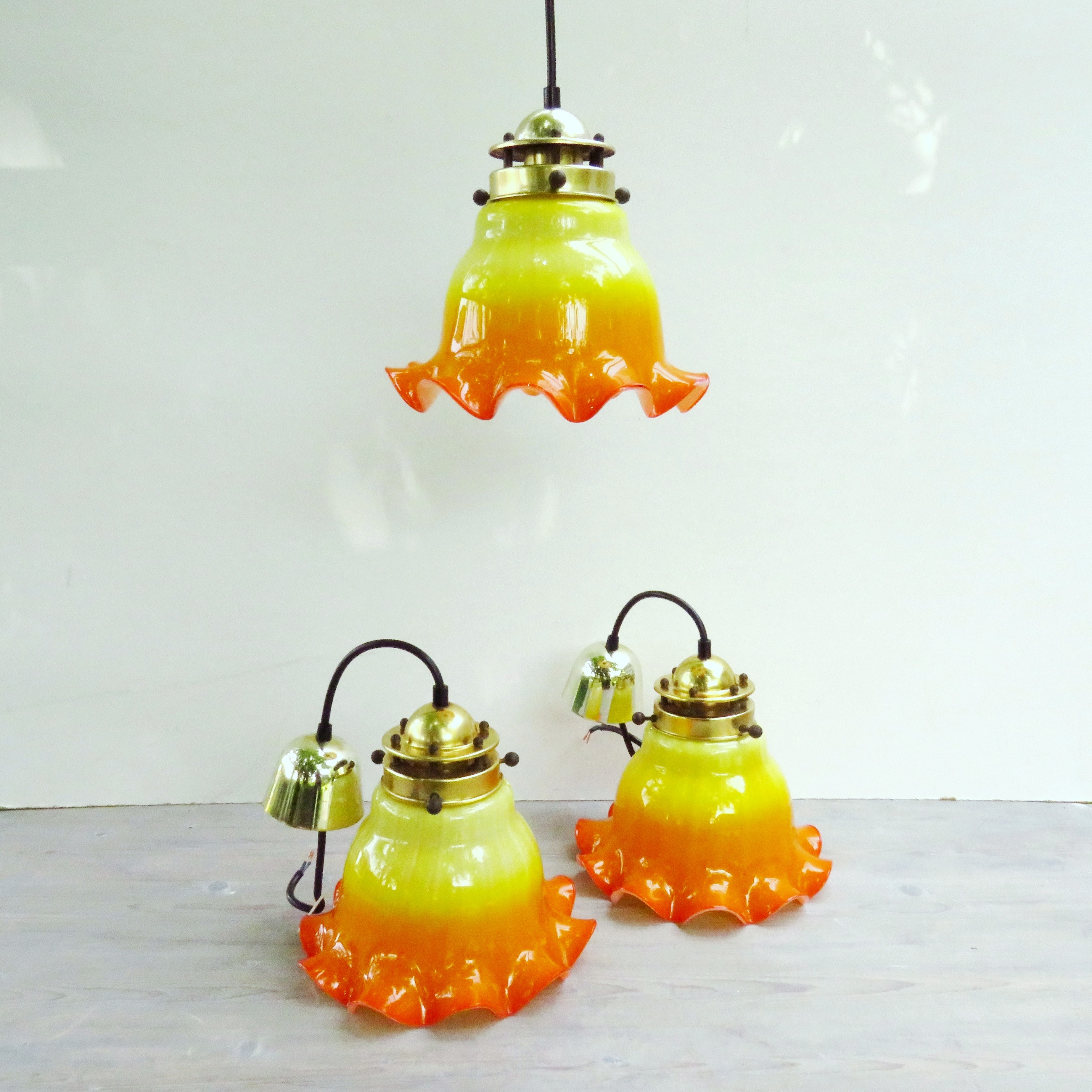 Vintage set of 3 pendant lights with yellow and orange glass lampshade.