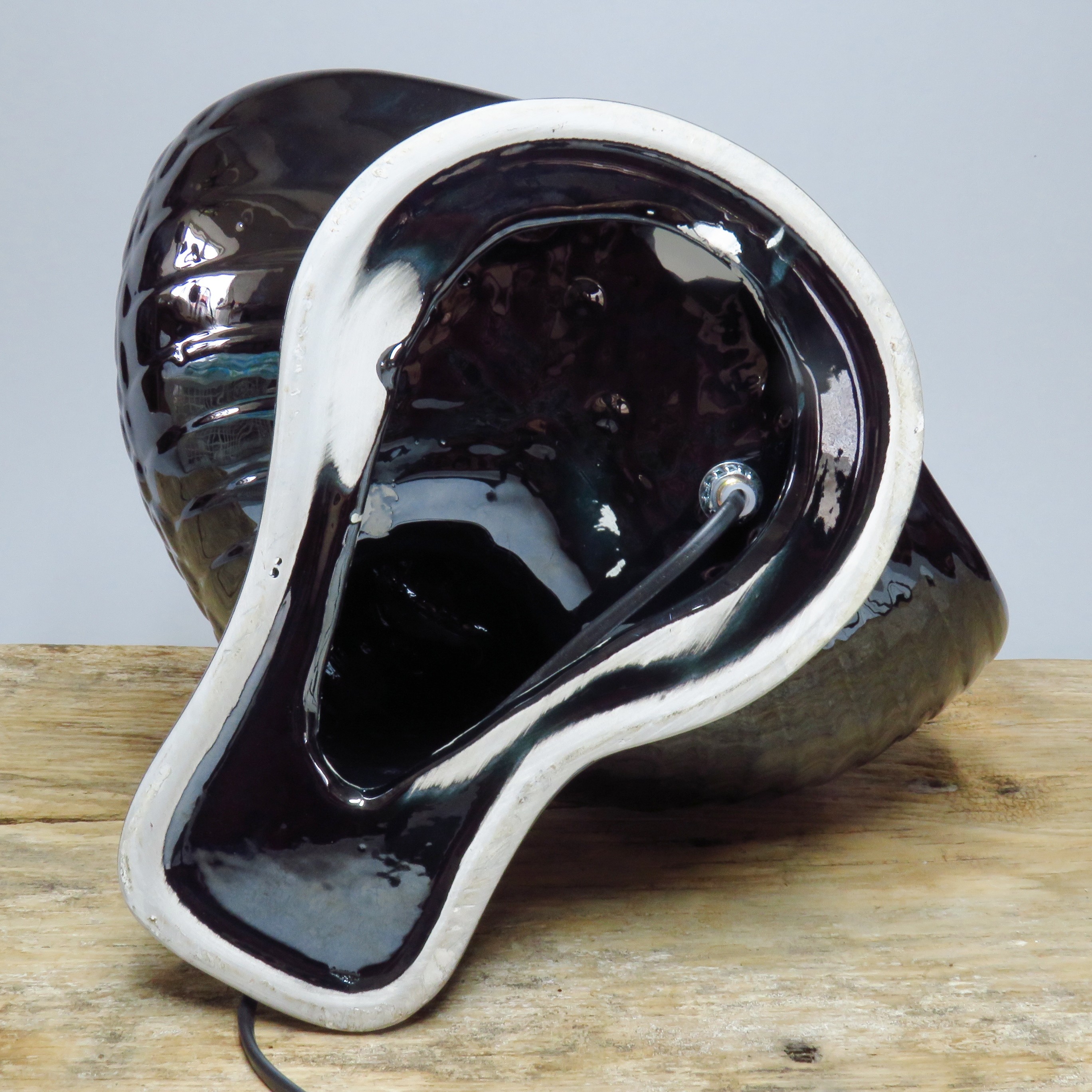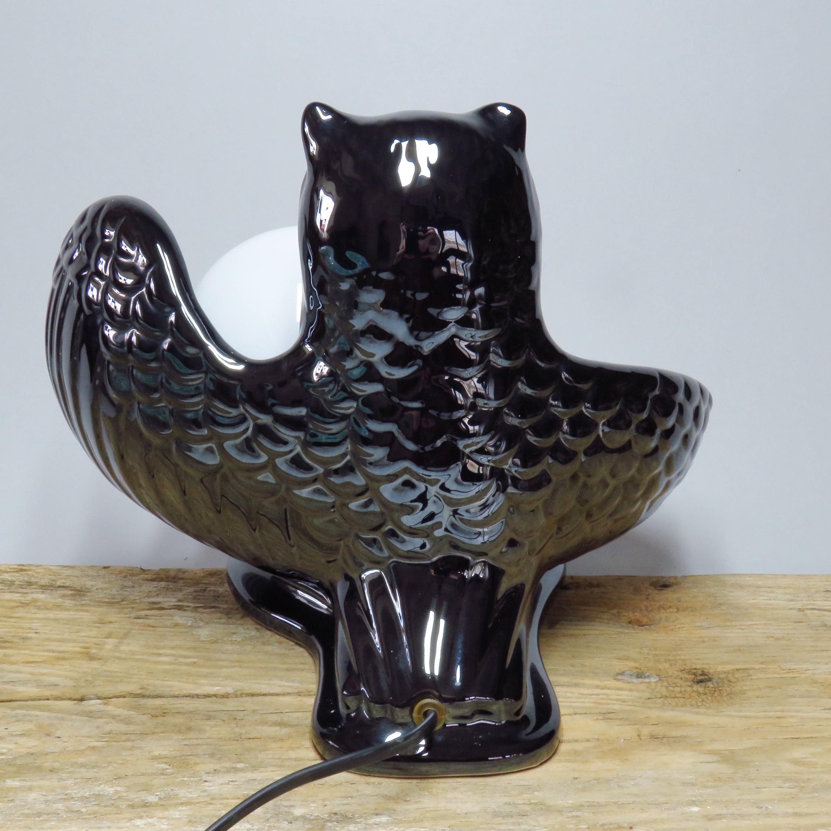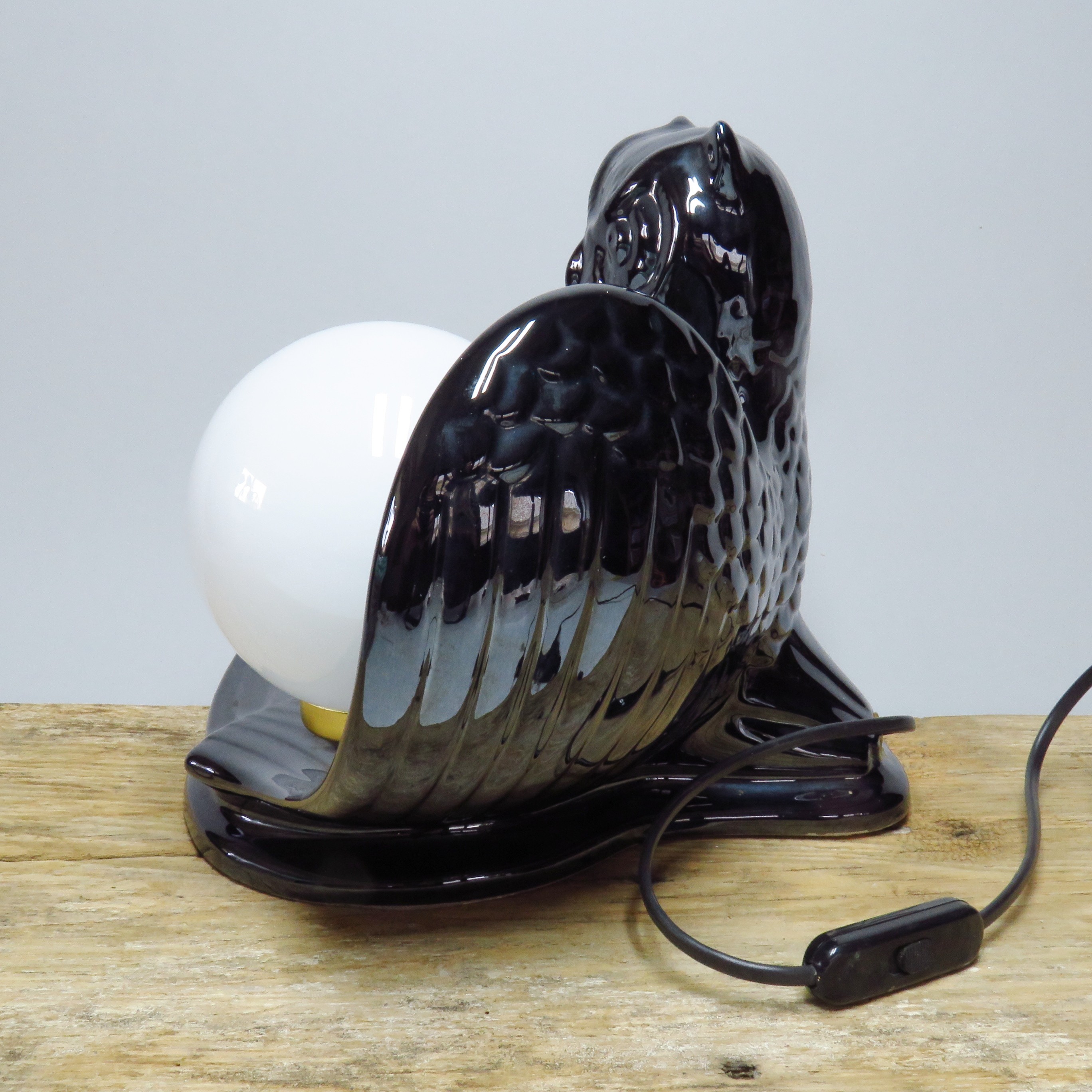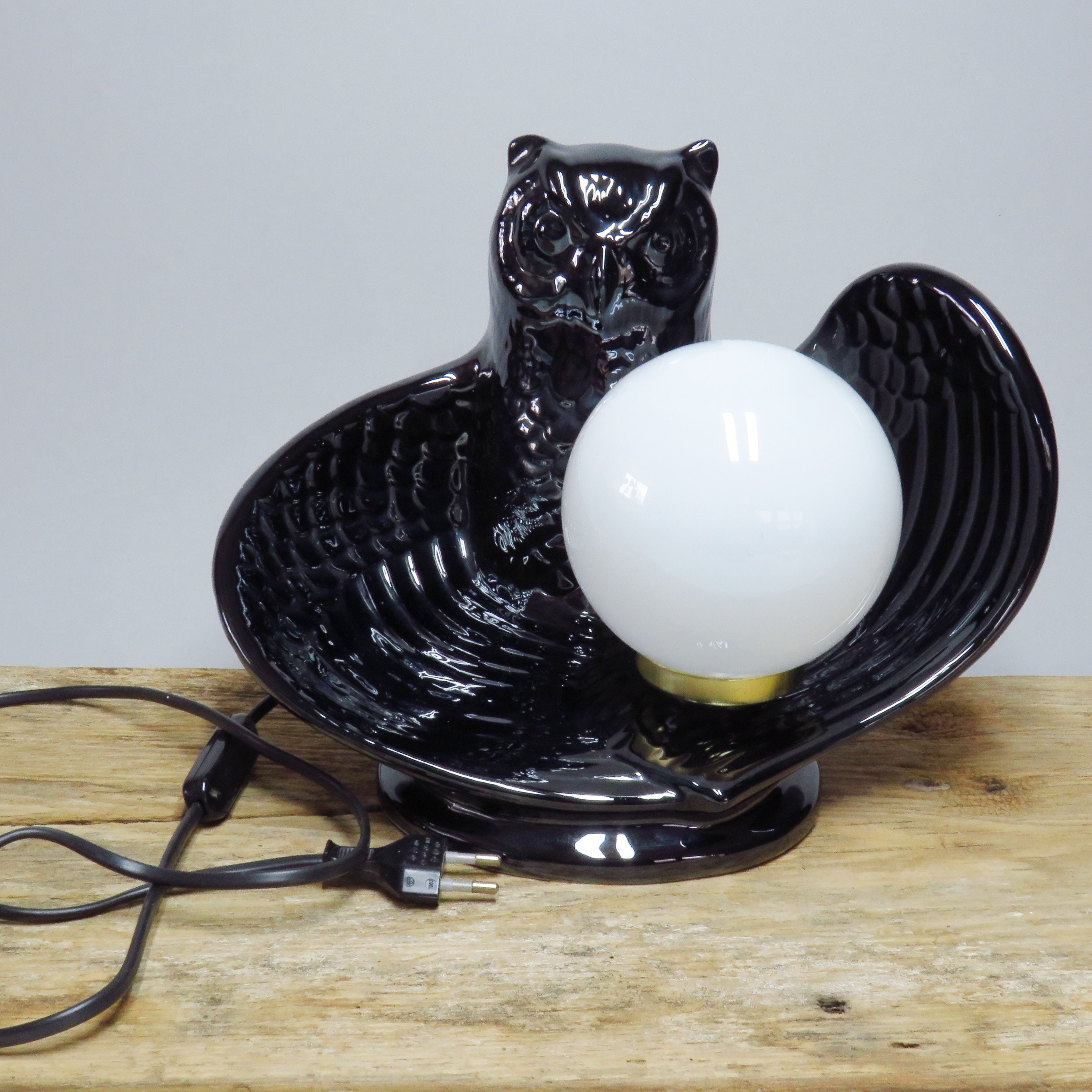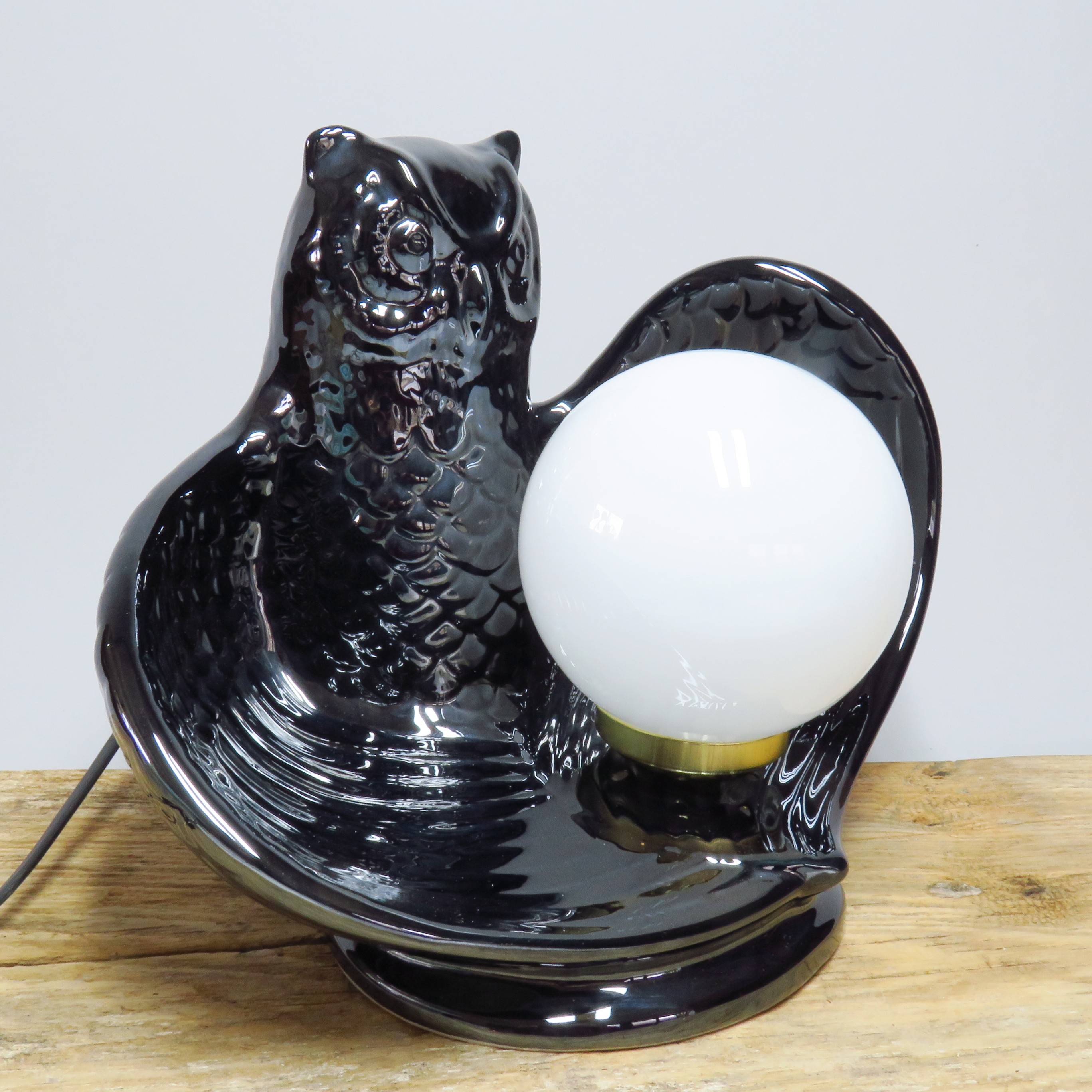 Vintage lampe de table en céramique noire en forme d'hibou, avec un abat-jour sphérique.