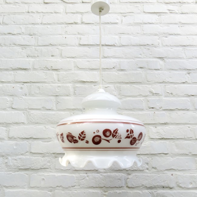 Vintage suspension en verre opalin avec décor floral / Vintage white opaline glass pendant light with floral decor